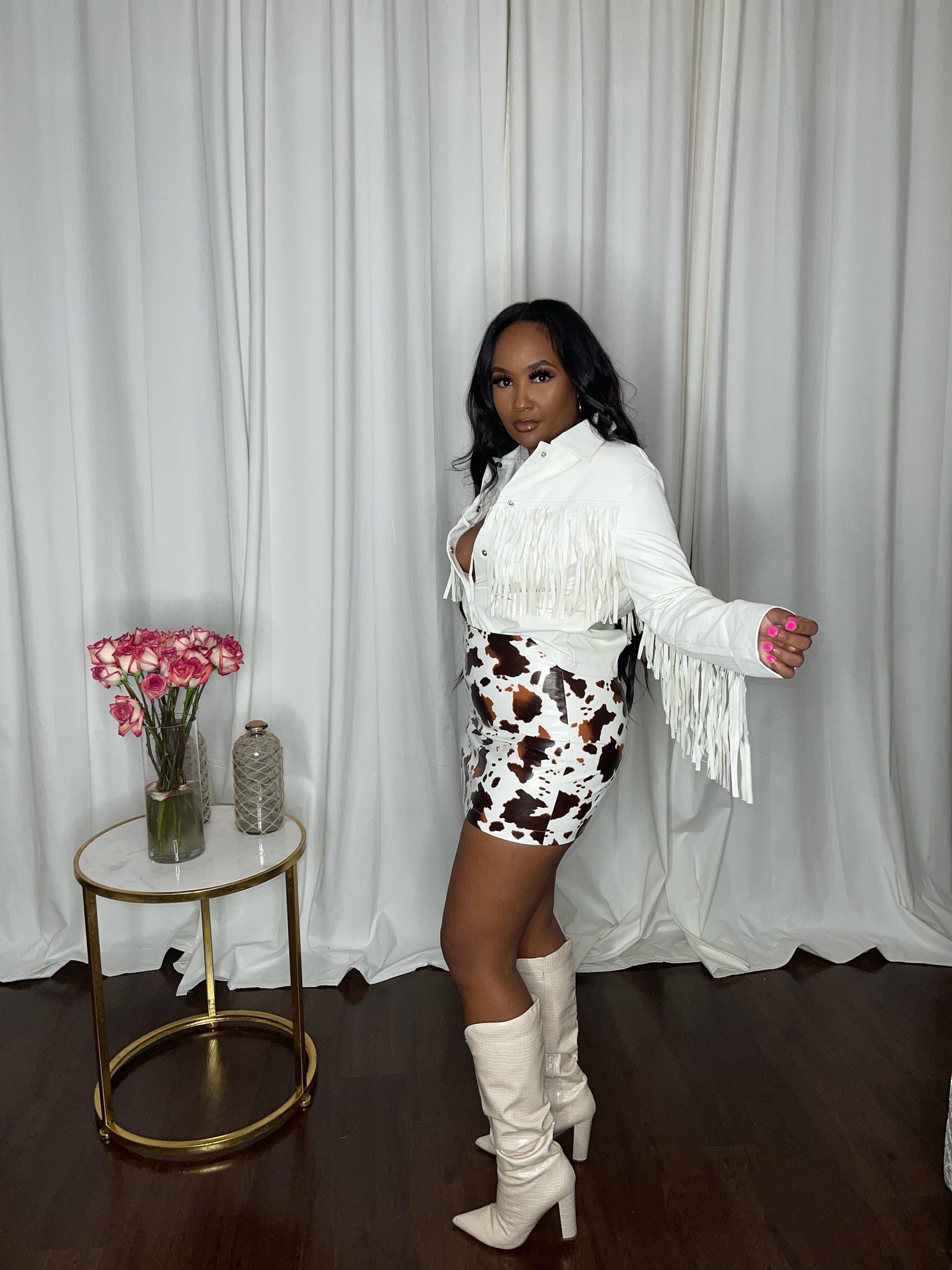 Cow hide PU leather mini skirt with zipper close back.
