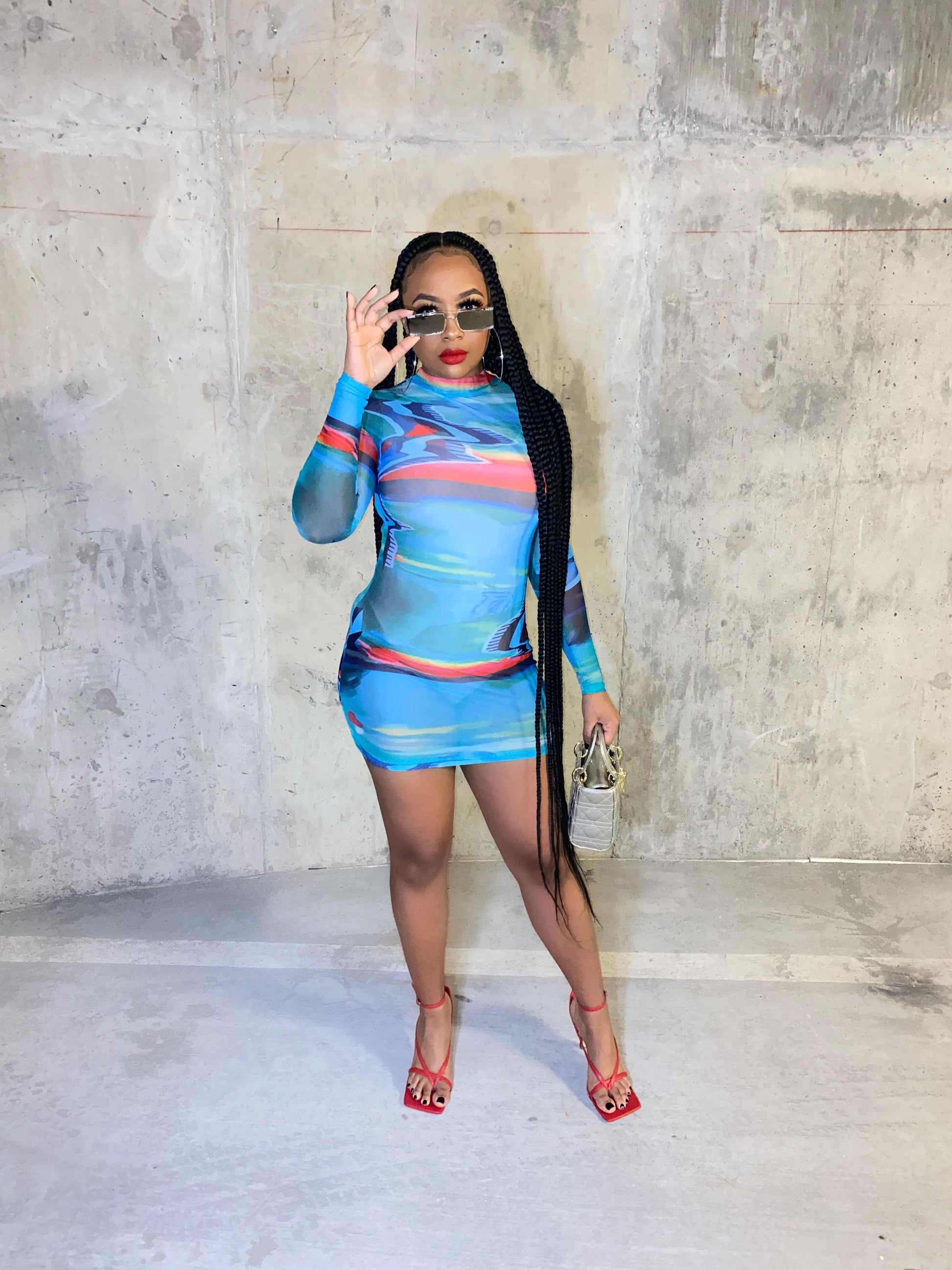 Blue-multicolored mesh dress with mock turtle neck.