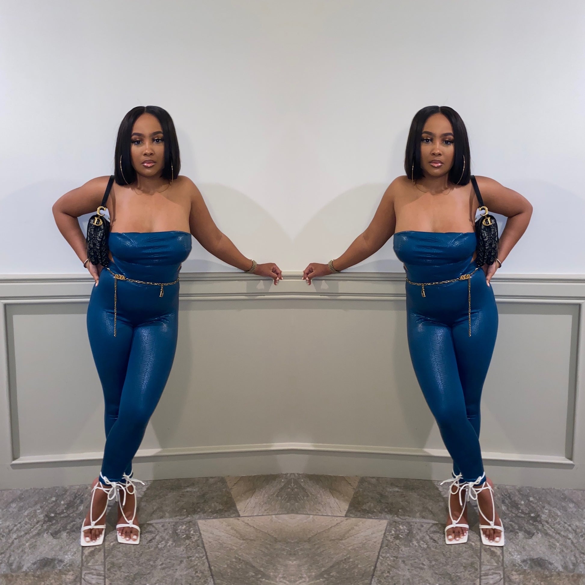 Two piece set snake skin print with spandex material. TOP IS HALTER shown with halter tucked in.
