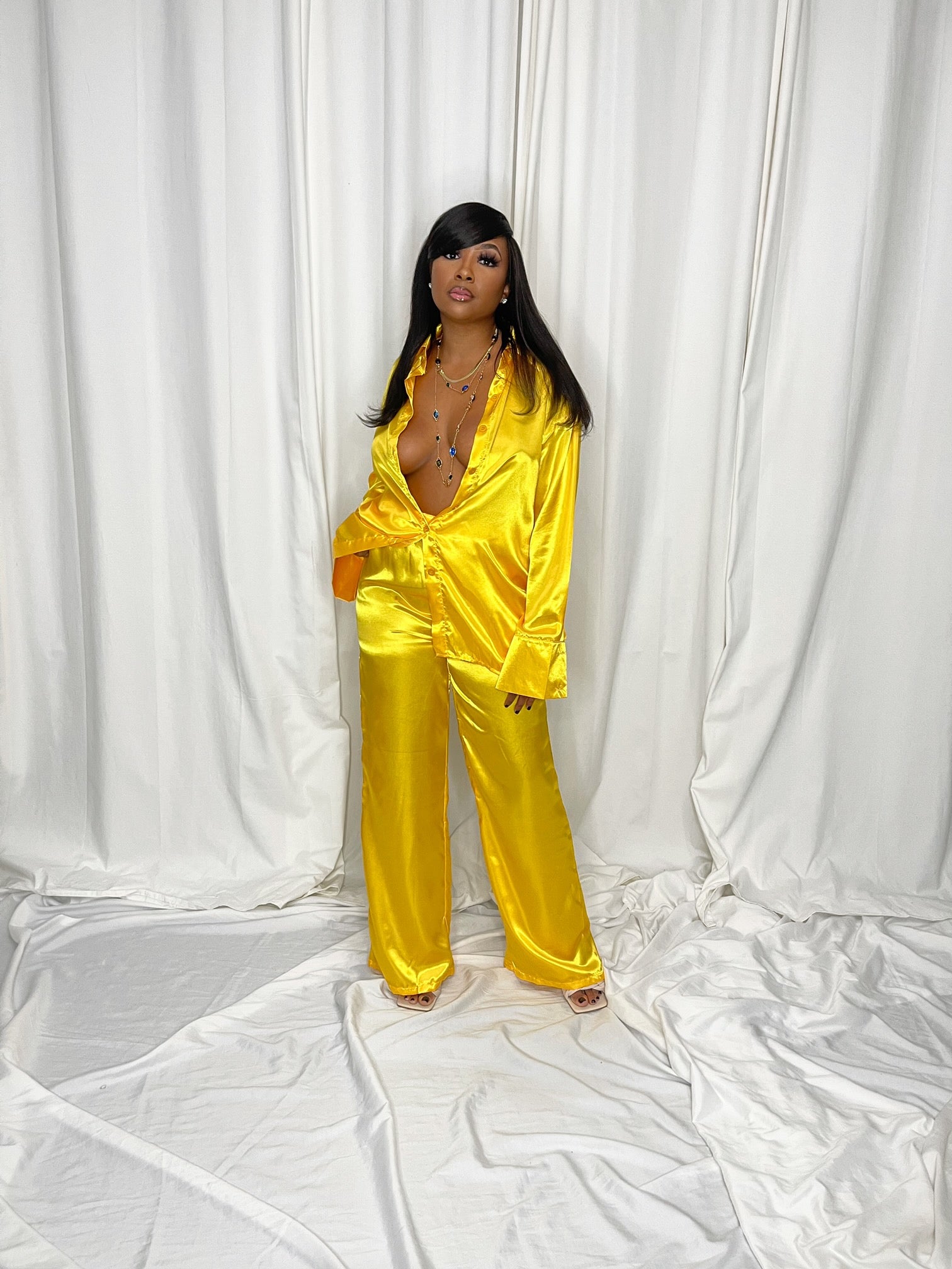 We love a good silk number. This chic two-piece set is a must have in your wardrobe babe. The waist band has great stretch and pants are great length (see bottom details for model height.