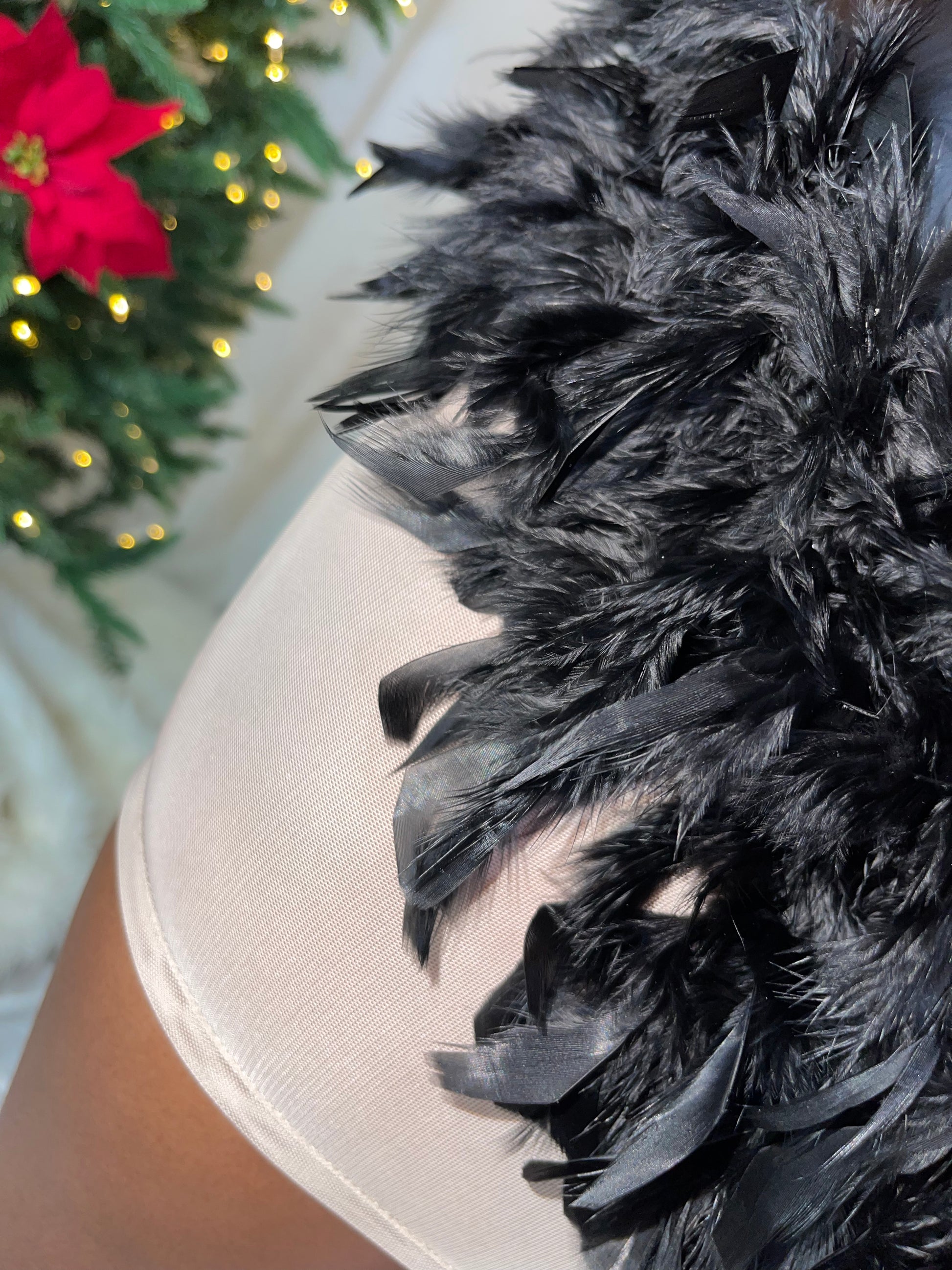 PU leather and sheer feather trim mini dress. Perfect evening dress for that special occasion. Most definitely a show stopper.
