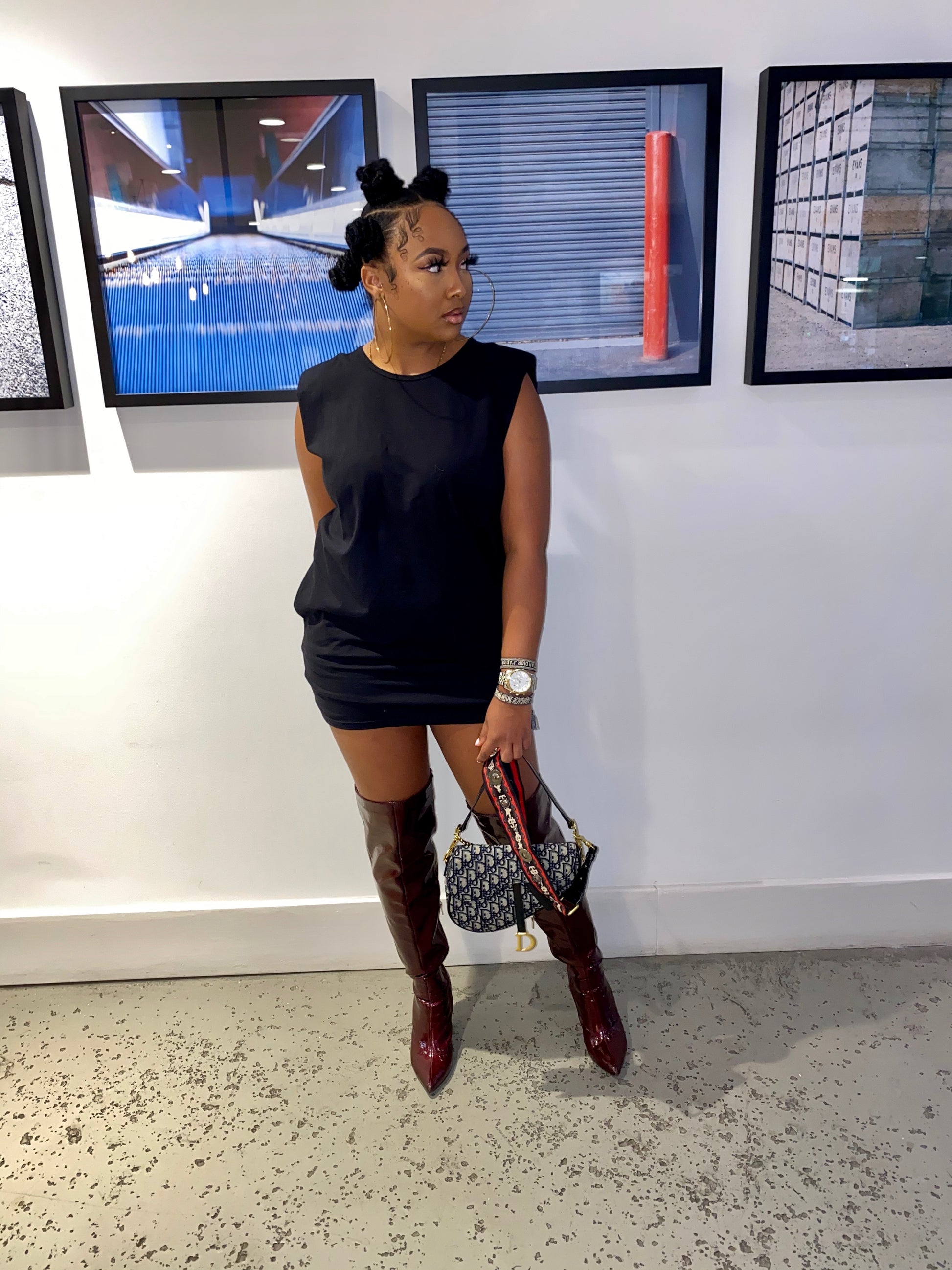 Padded shoulder muscle dress with pockets. Can be dressed up or casual read below for size details.
