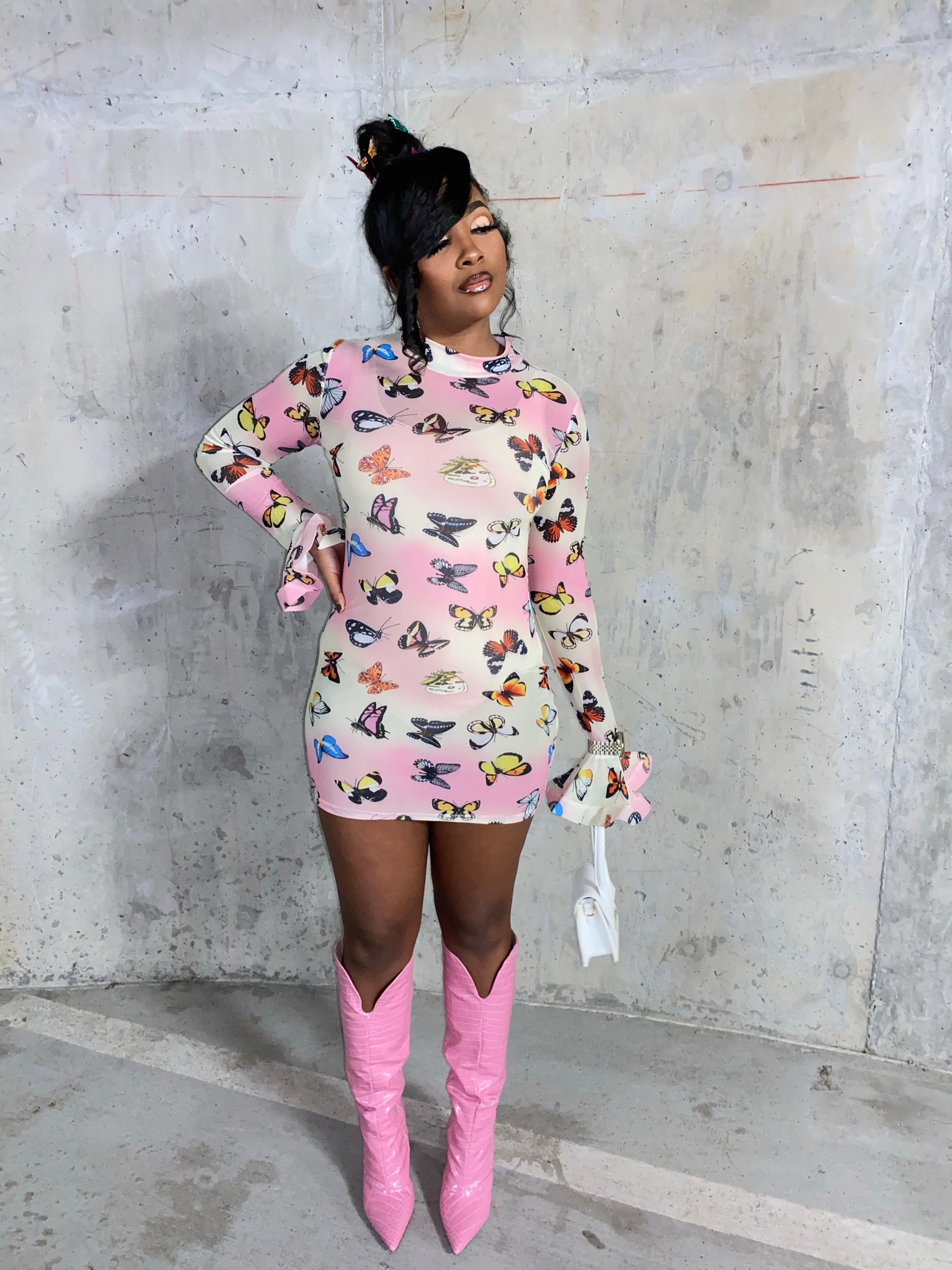 Mesh turtle neck dress with bell sleeves. LAST RESTOCK item is shown styled three different ways.