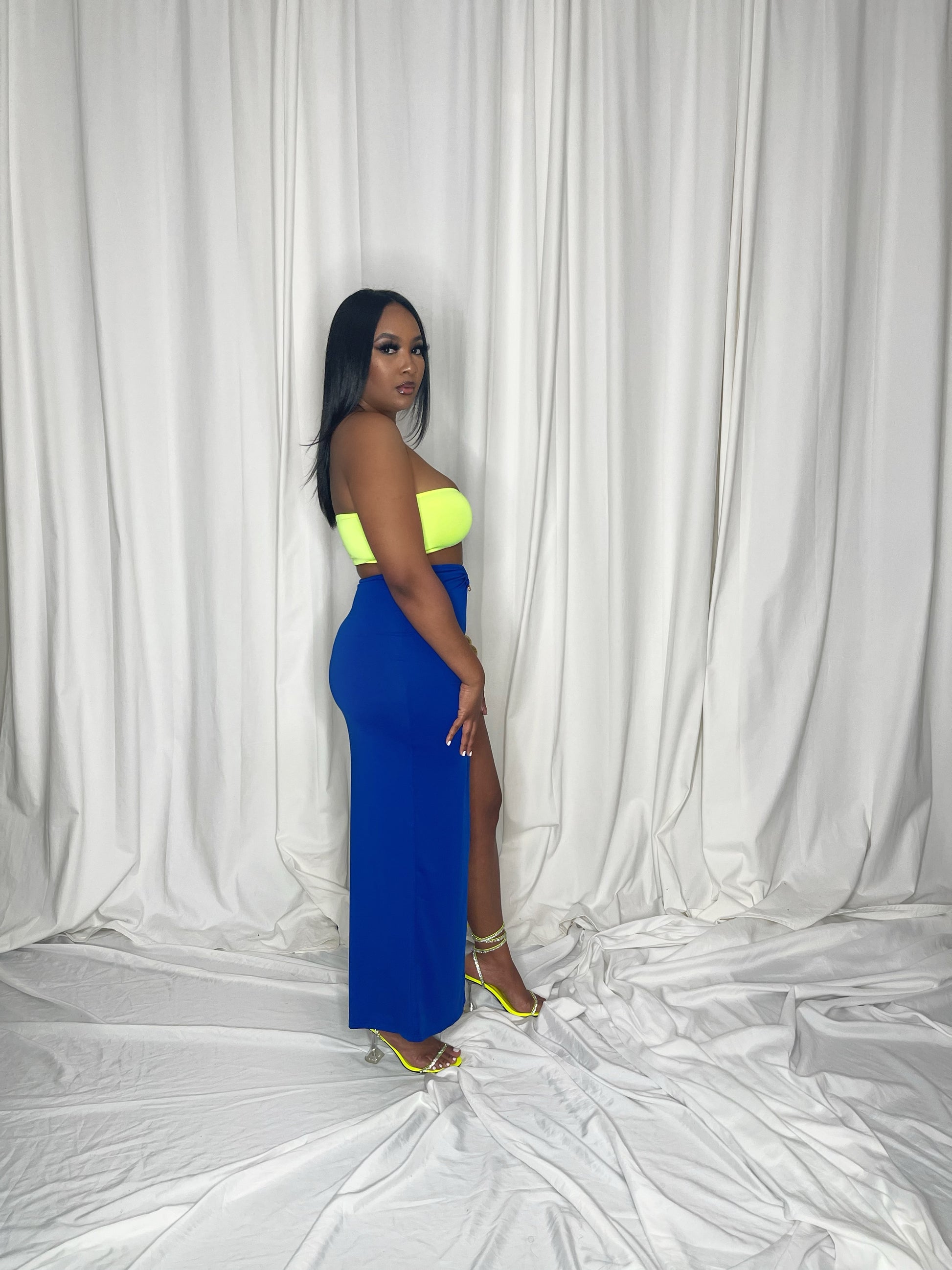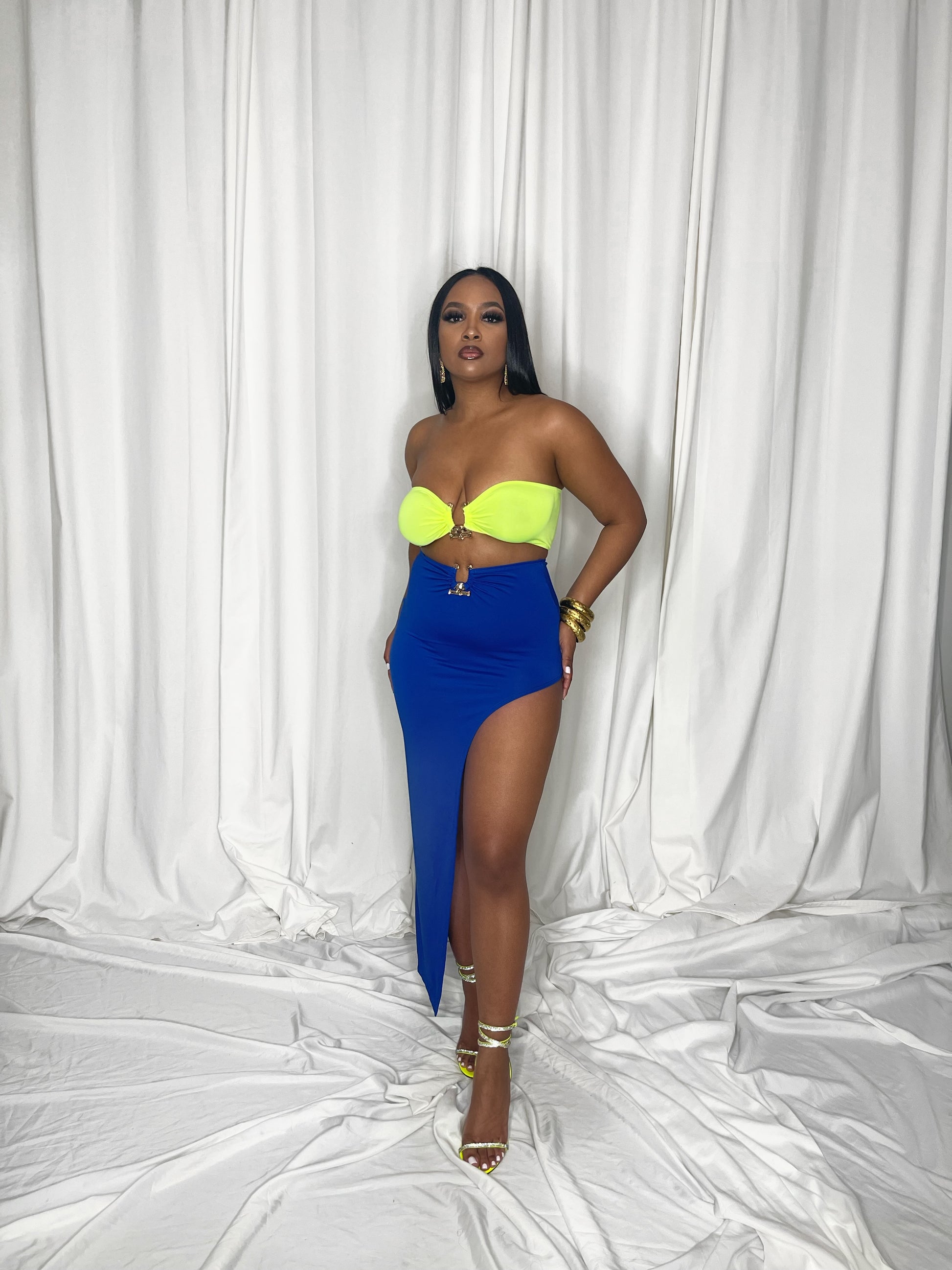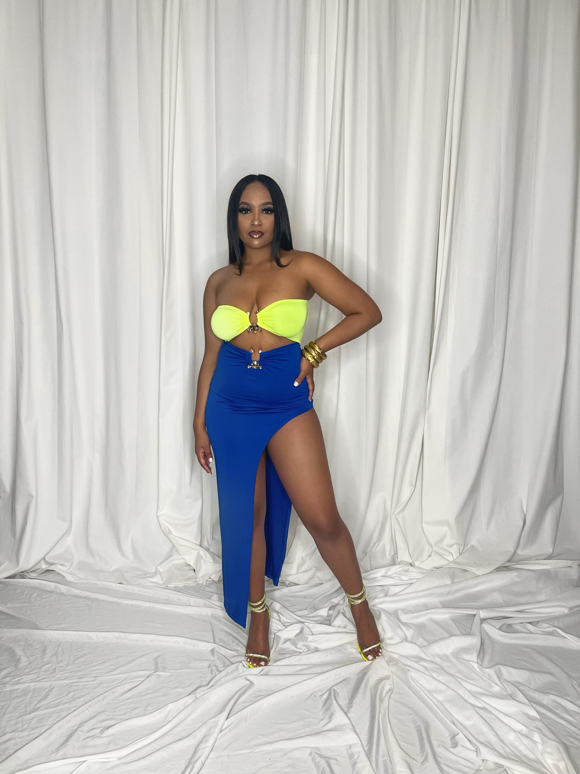 Neon yellow bandeau top paired with an blue high waist skirt set. Both top and skirt has a gold ring centered. Spandex material great stretch.