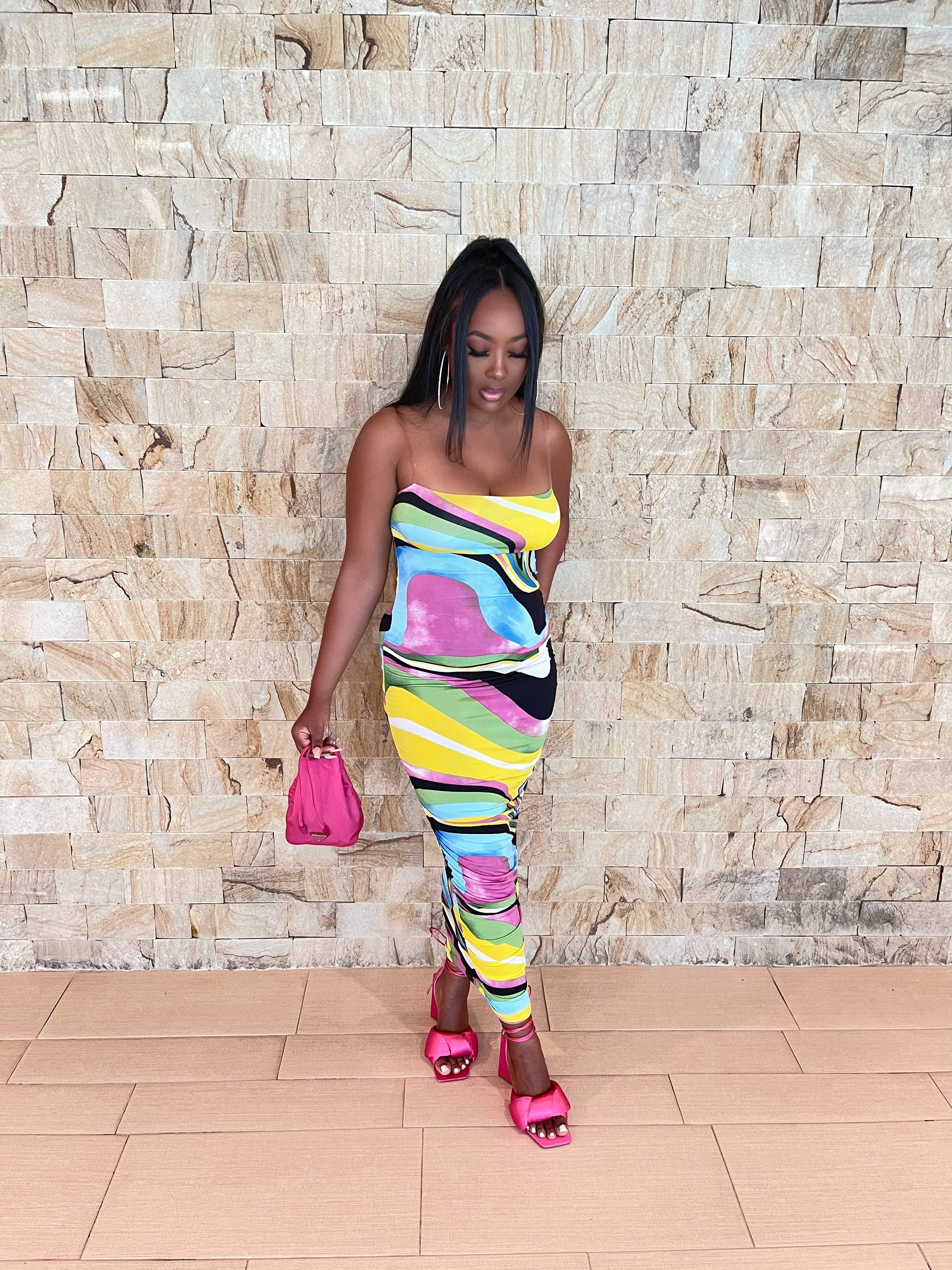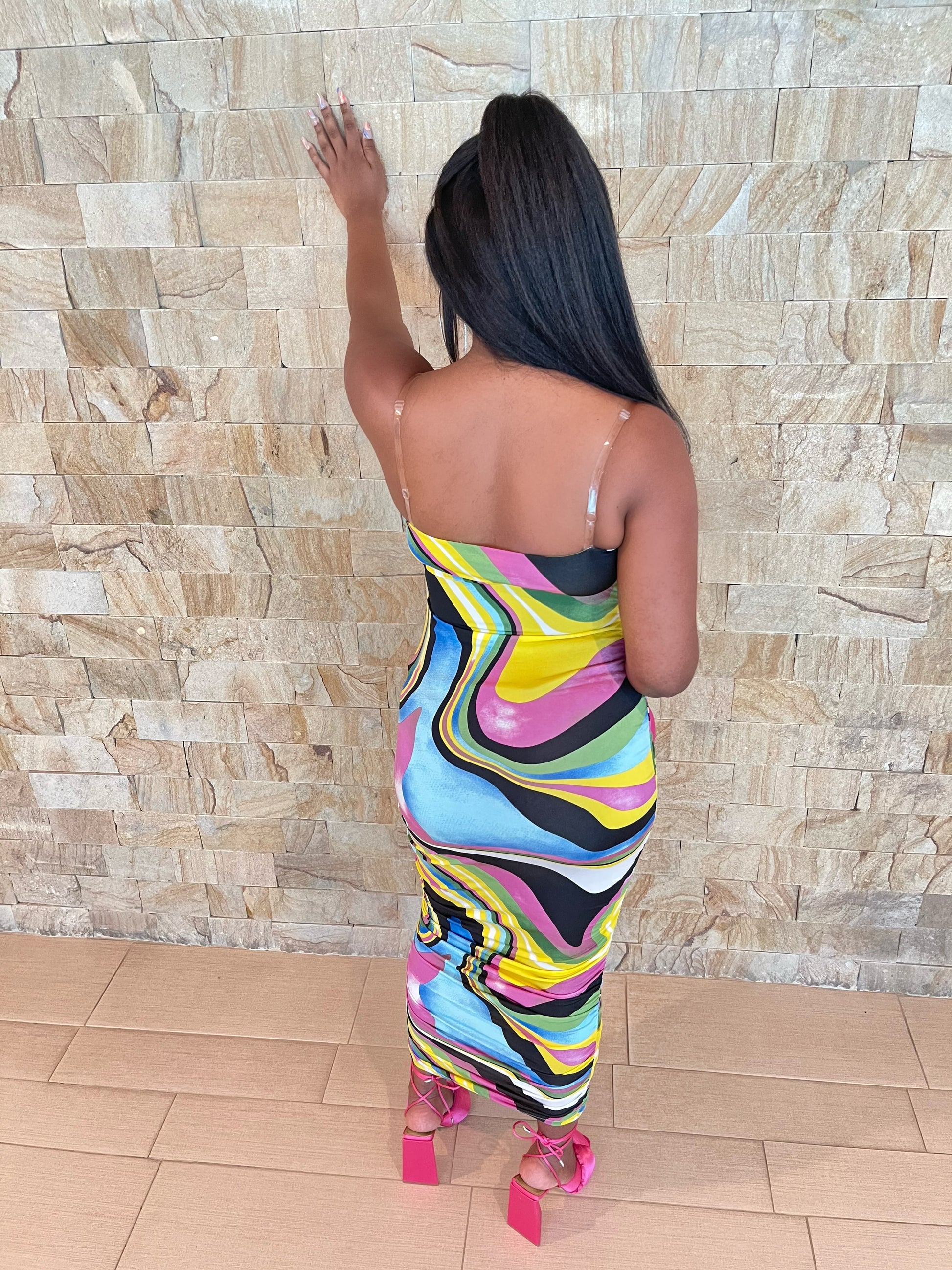 Multicolored printed dress with adjustable clear bra strap. This look can be worn as a dress or midi skirt. (check pictures for skirt look). Chest area is double lined.