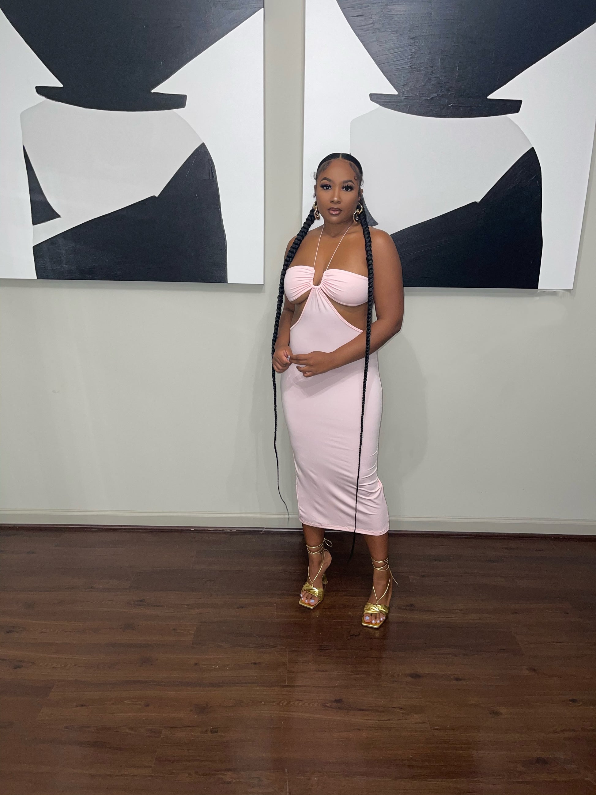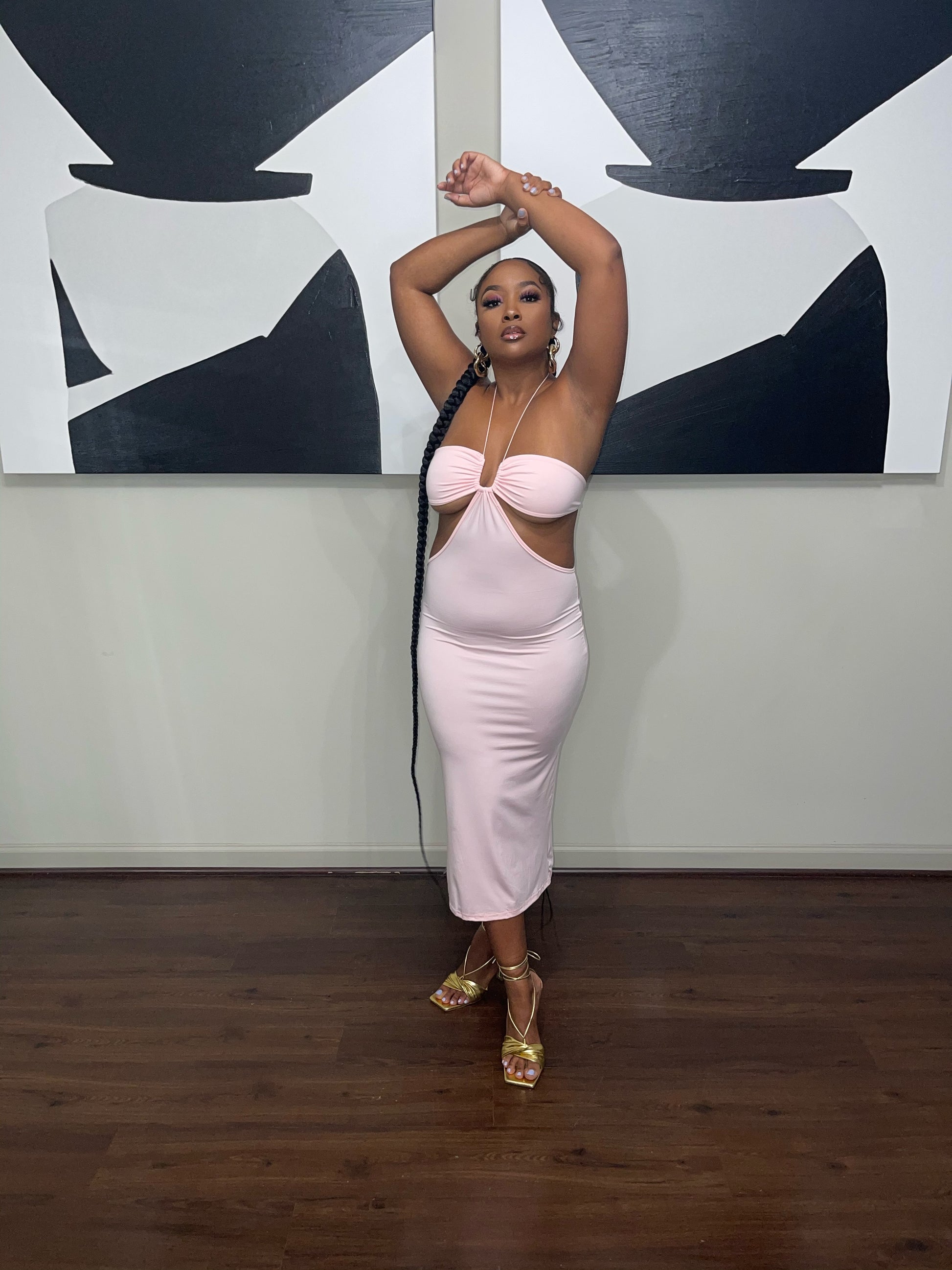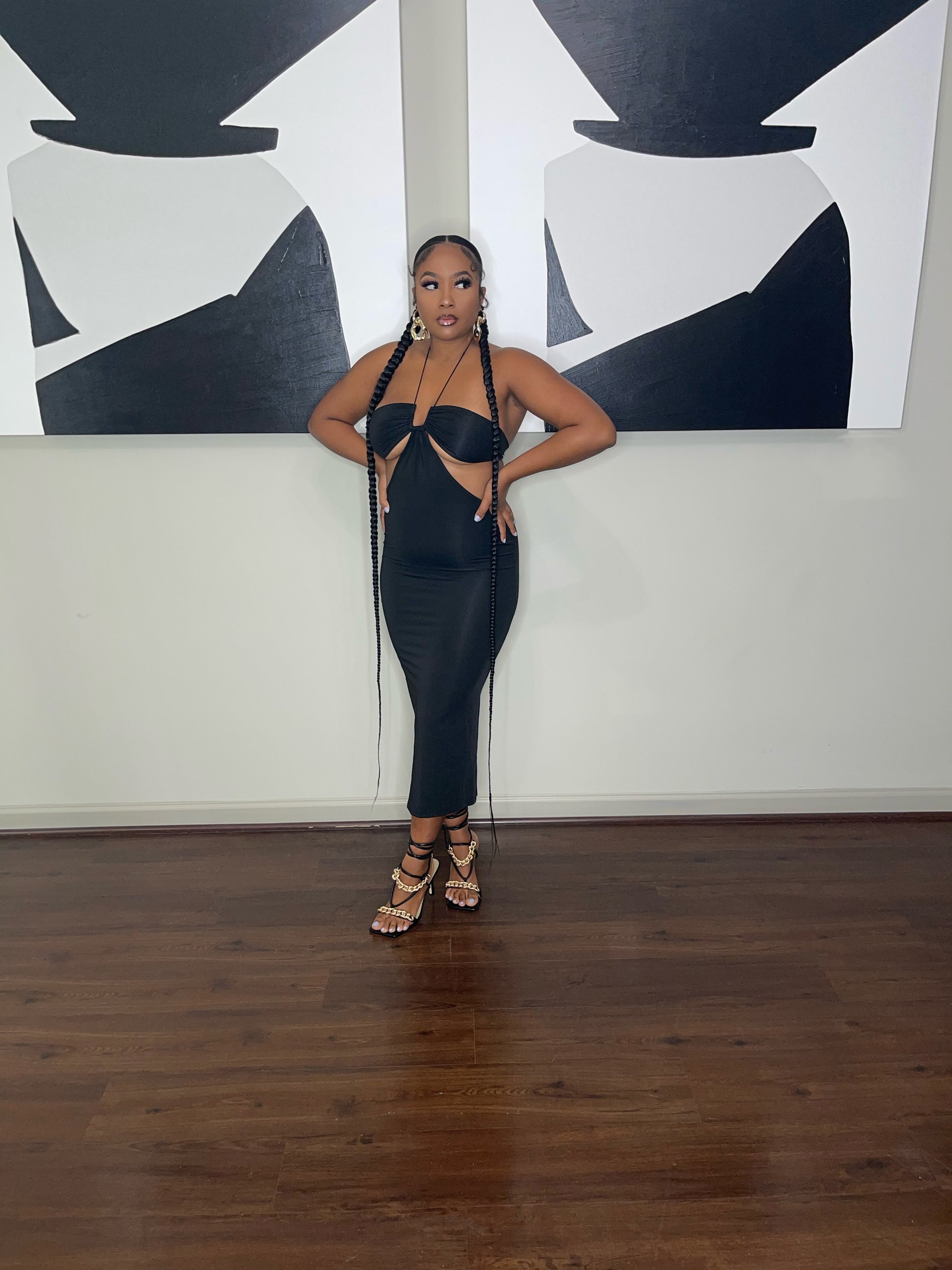 U-hook bandeau dress with halter string tie. Midi length with high V split in the back of dress.