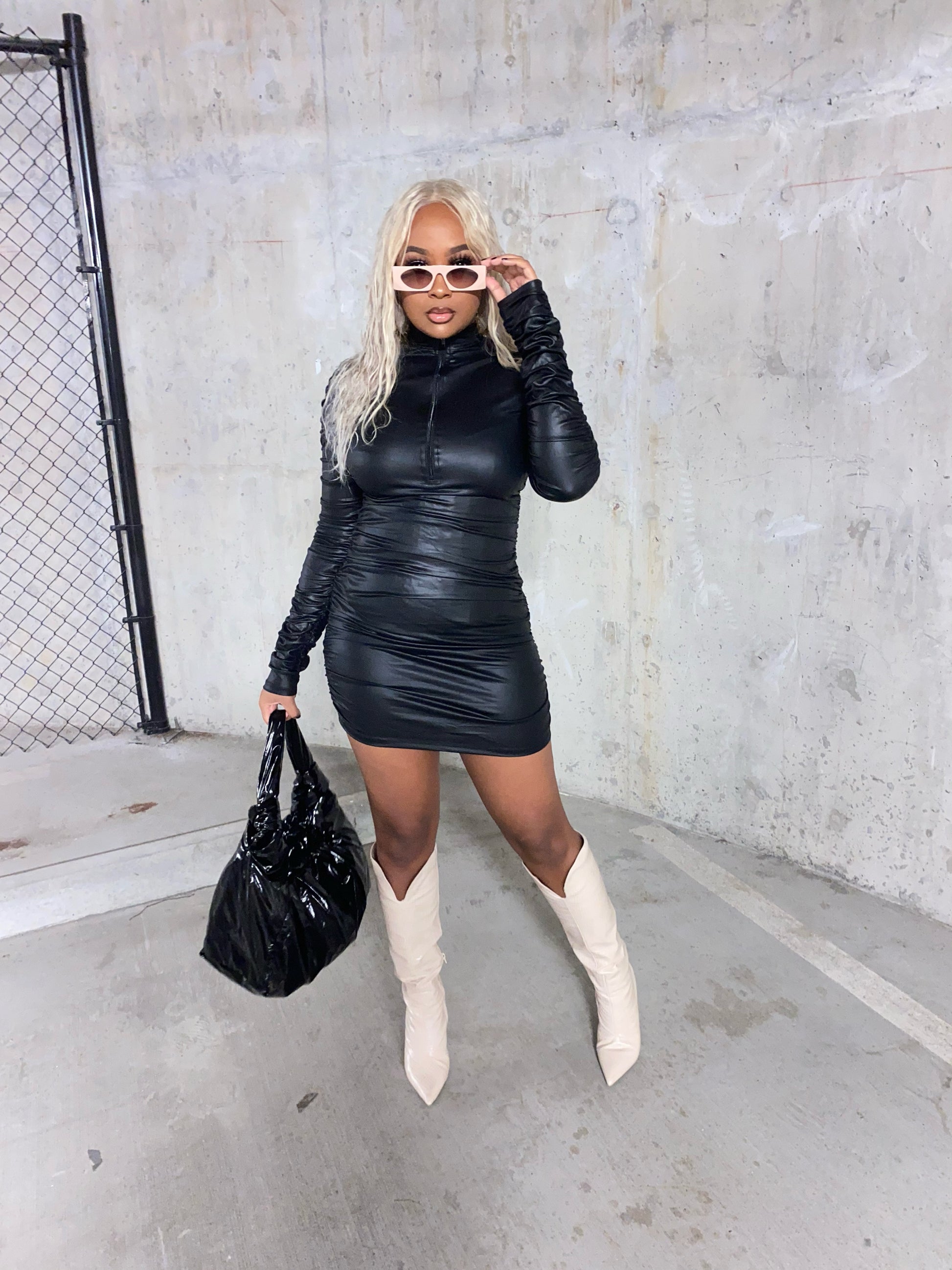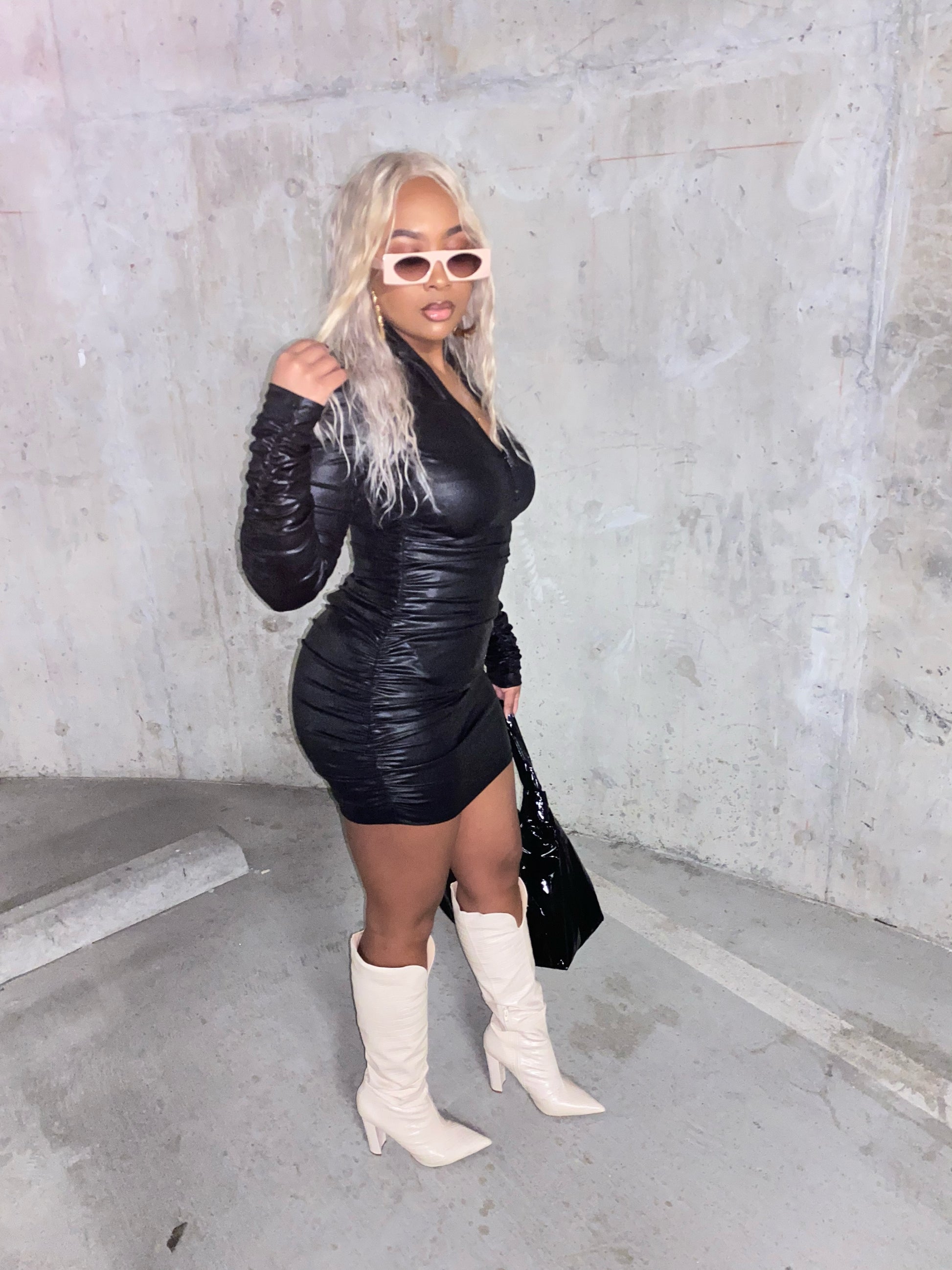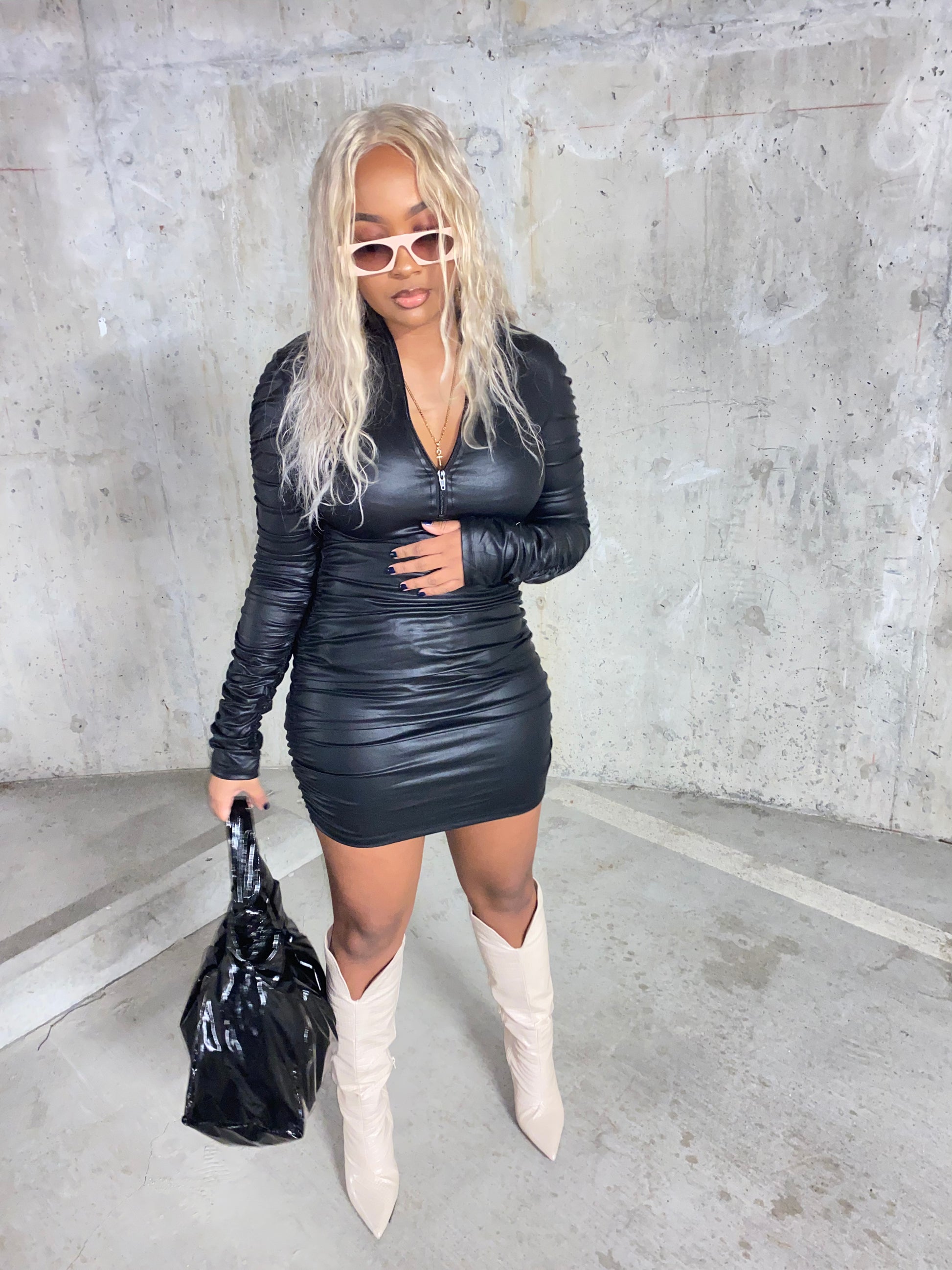 Ruched faux leather mini dress, great stretch with tight fit, ruched back detail.