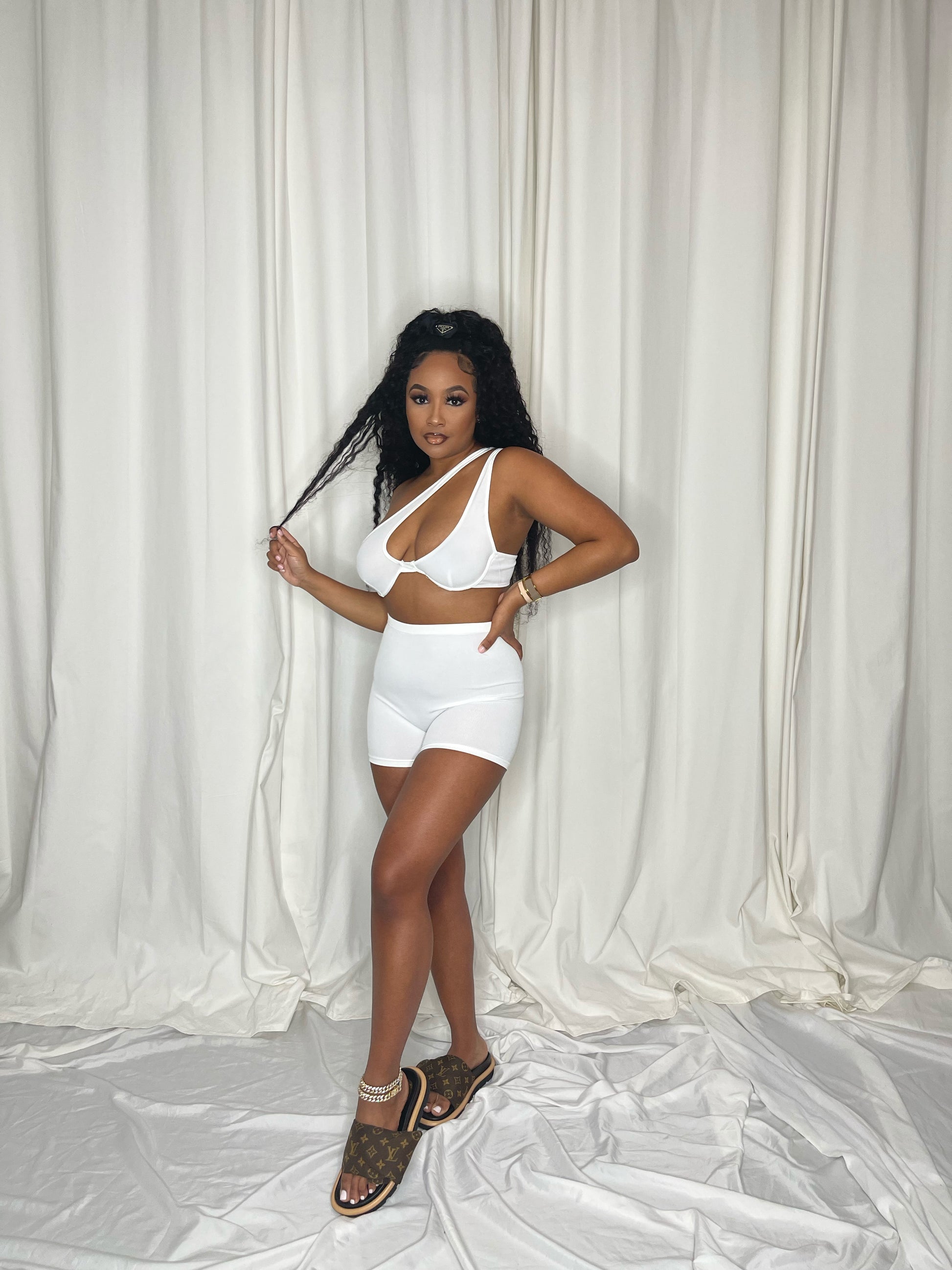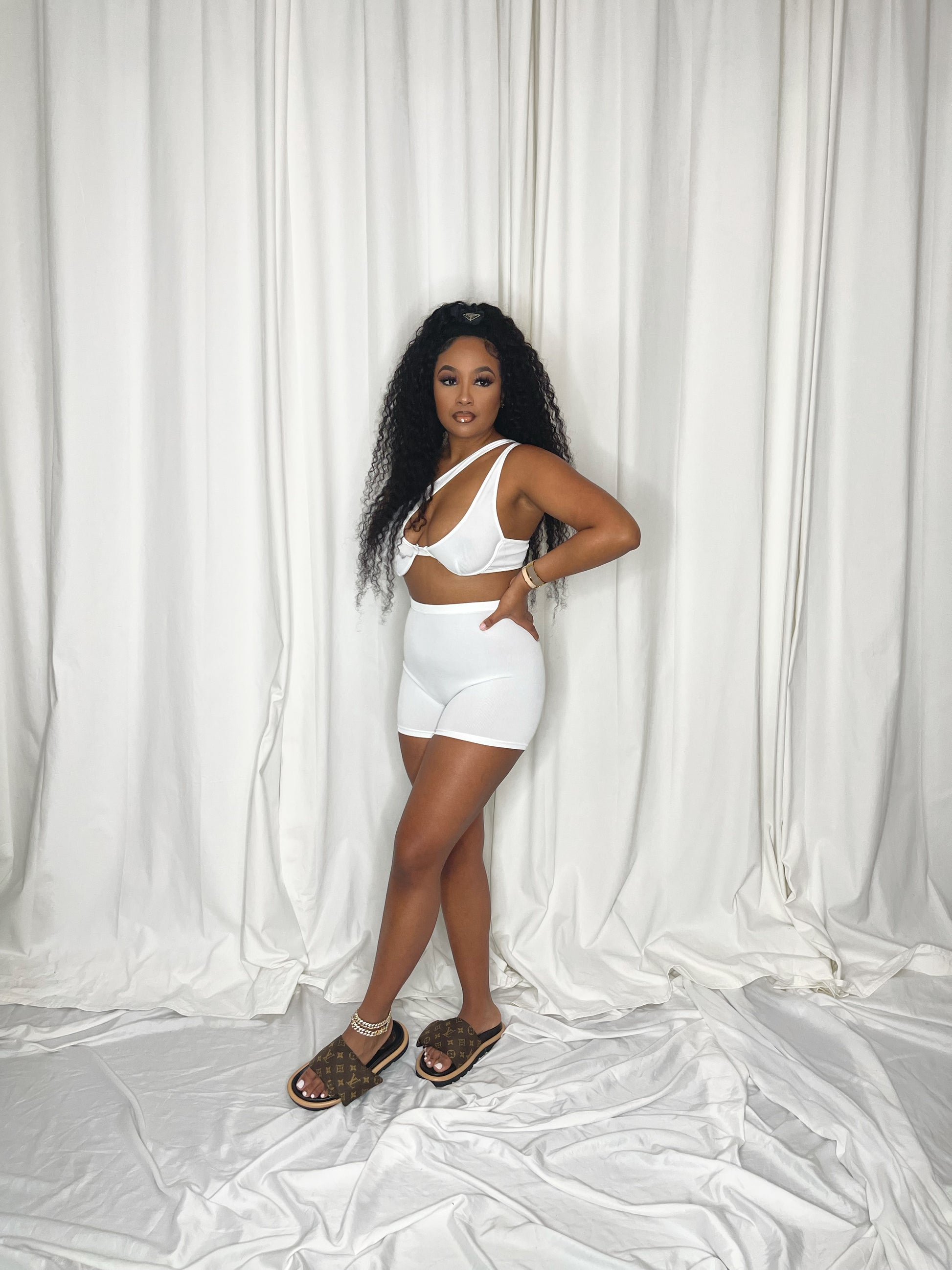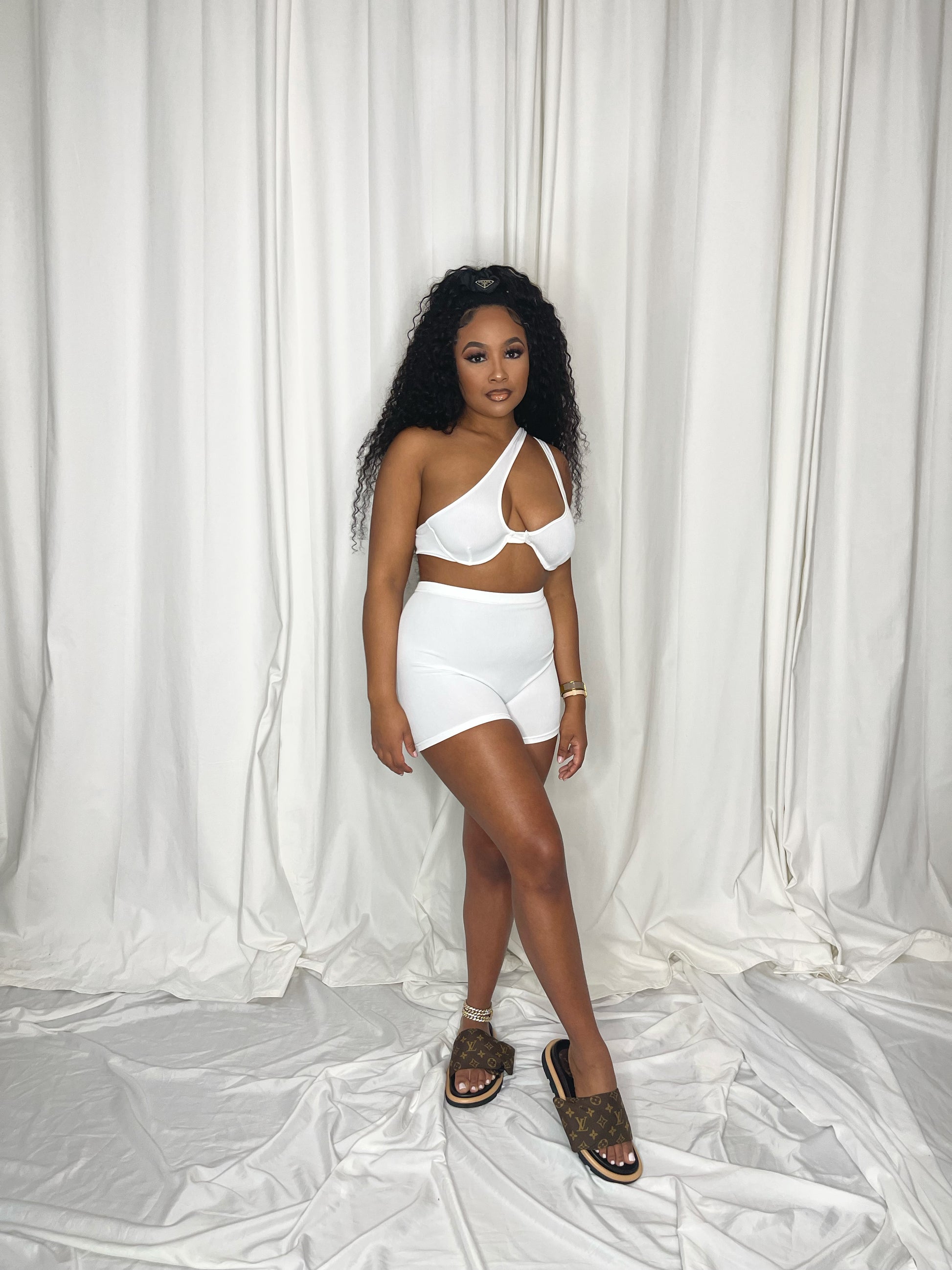 Two-piece ribbed set with one shoulder bralette and spandex shorts.