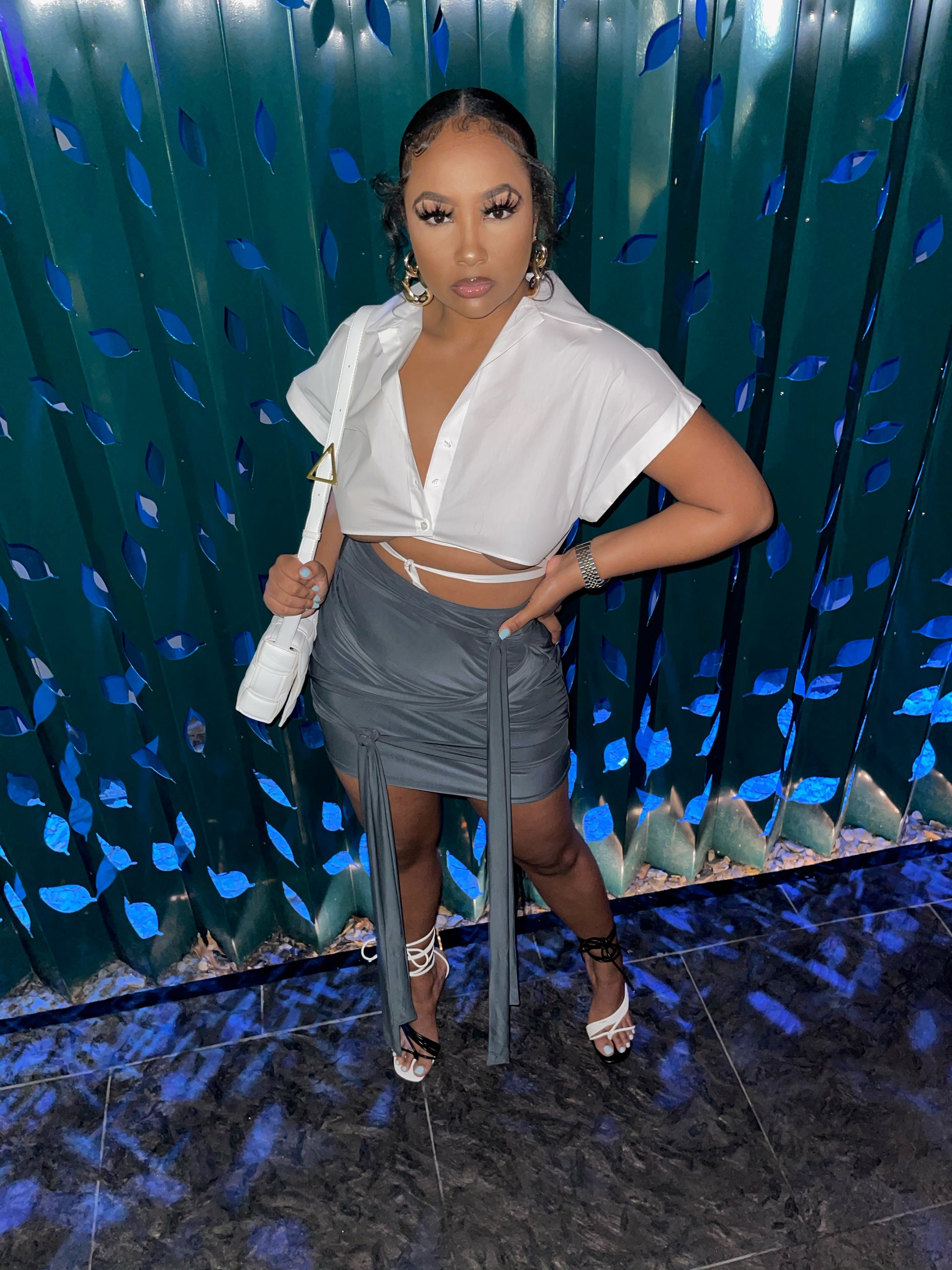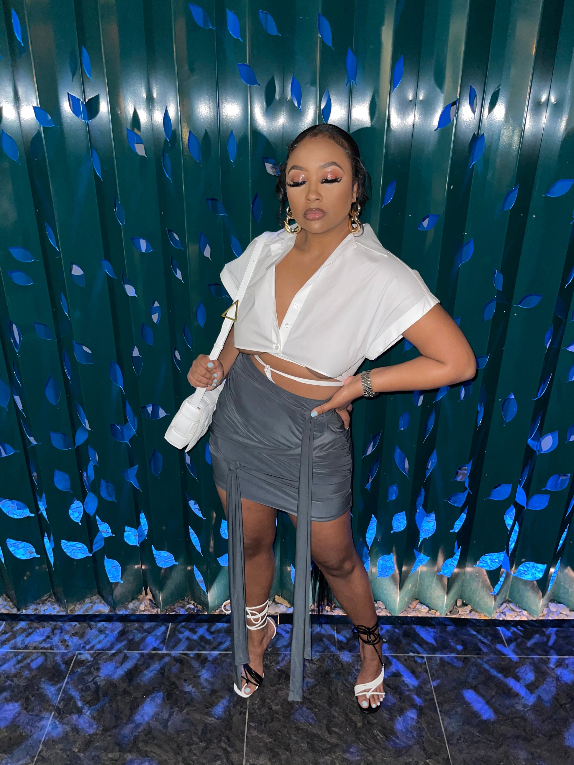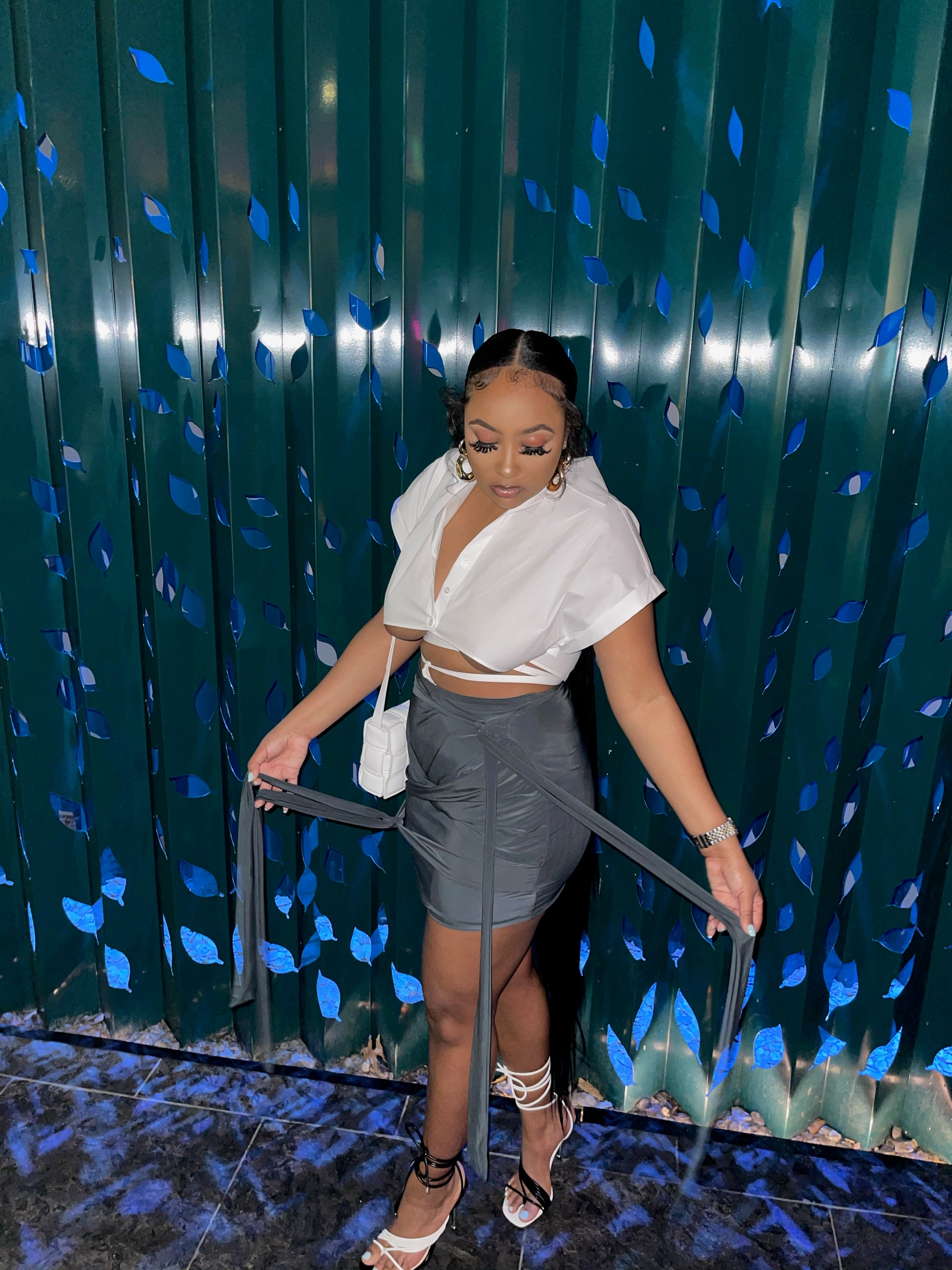Charcoal Grey tie skirt, two strings on each side. Skirt can be worn tied or untied.