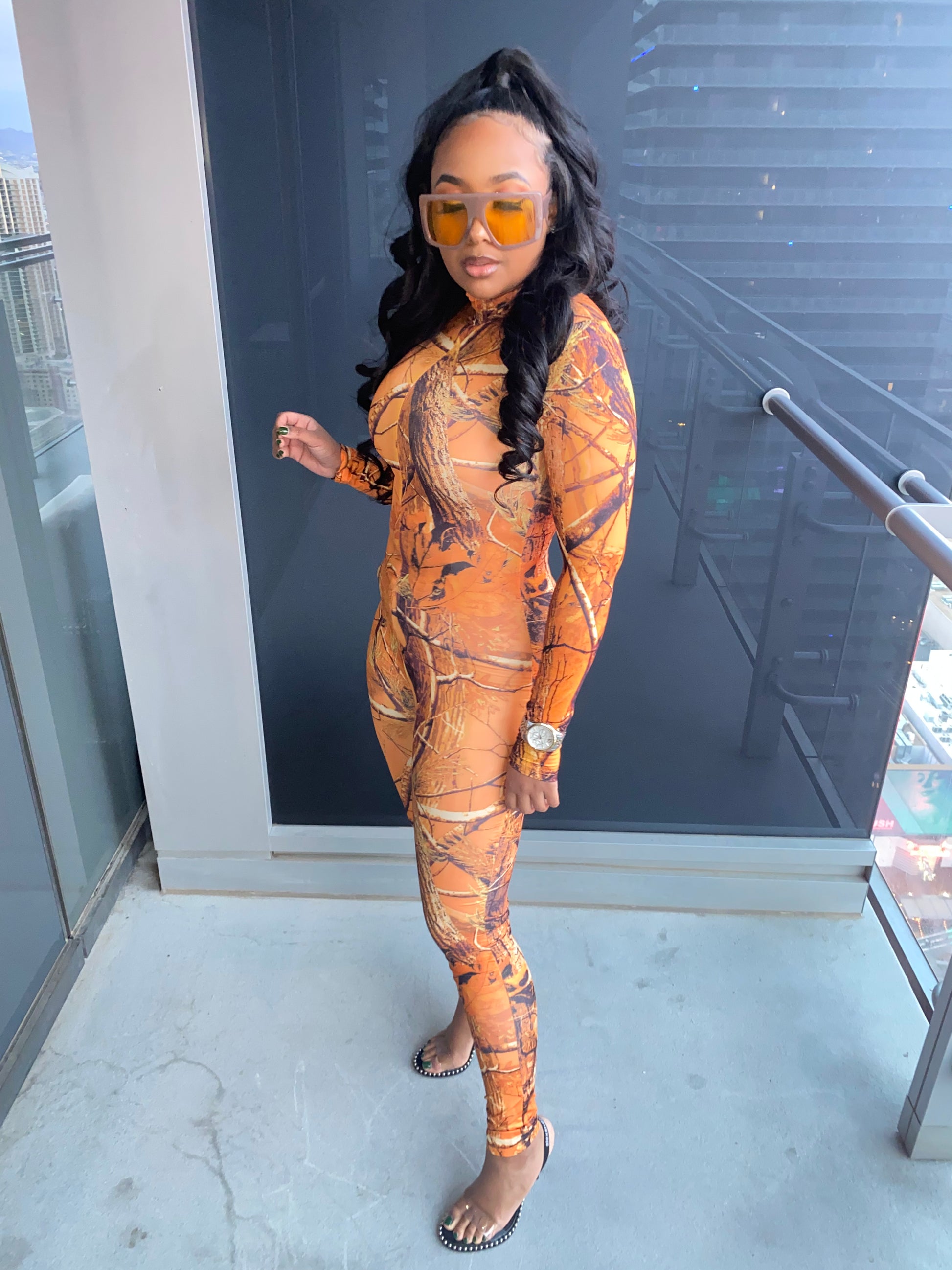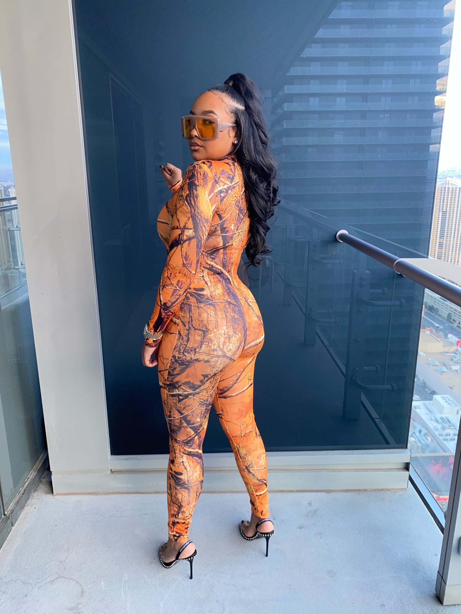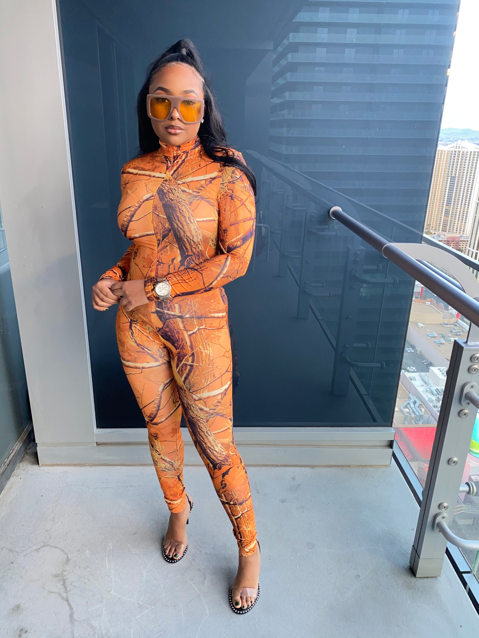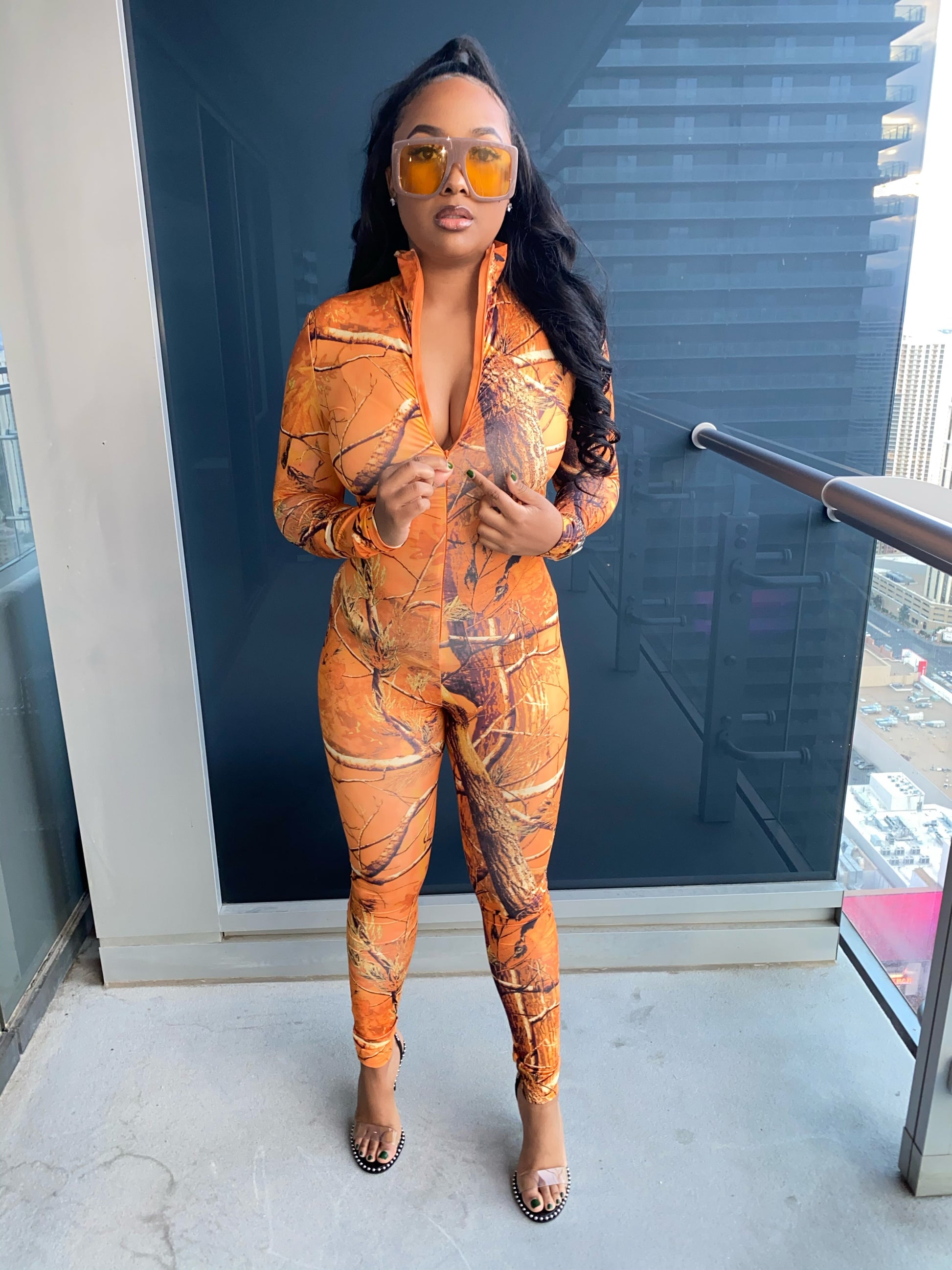 Orange camouflage printed jumpsuit zips to close. Zipper can be worn in the front or back.