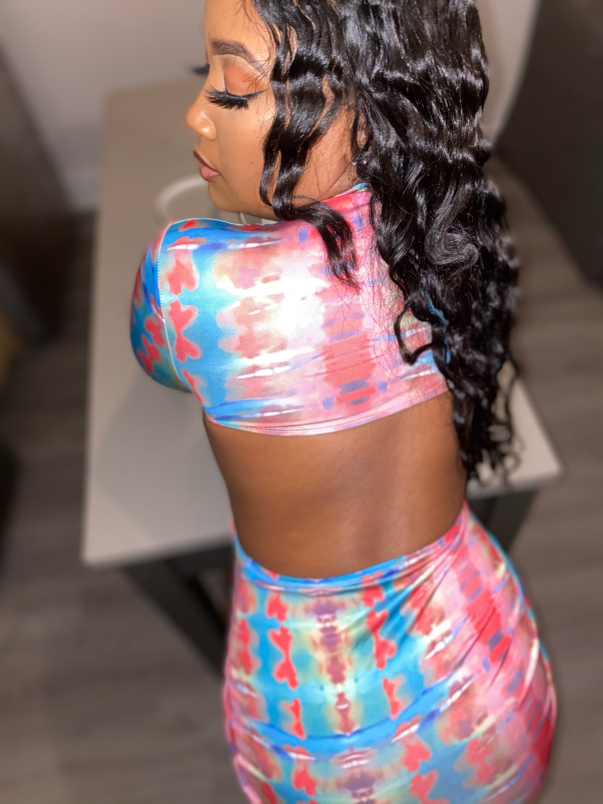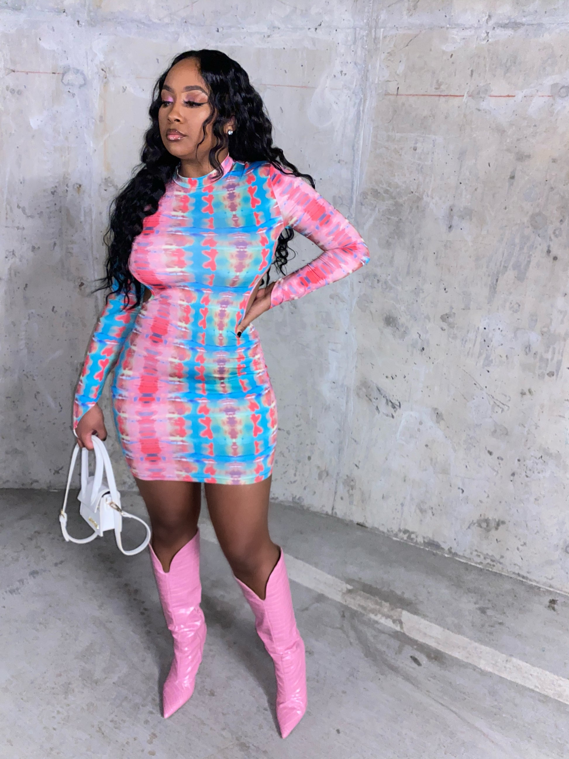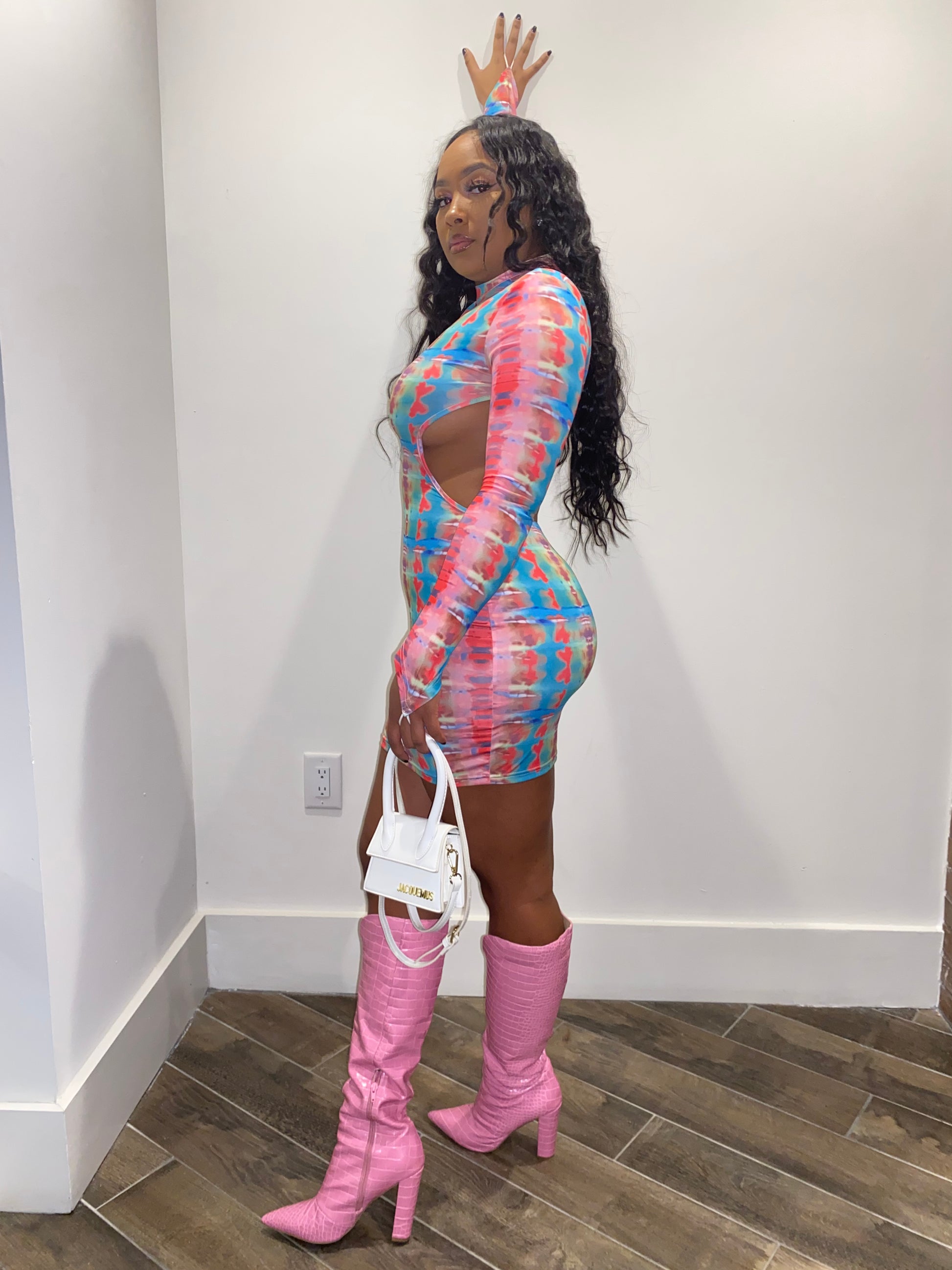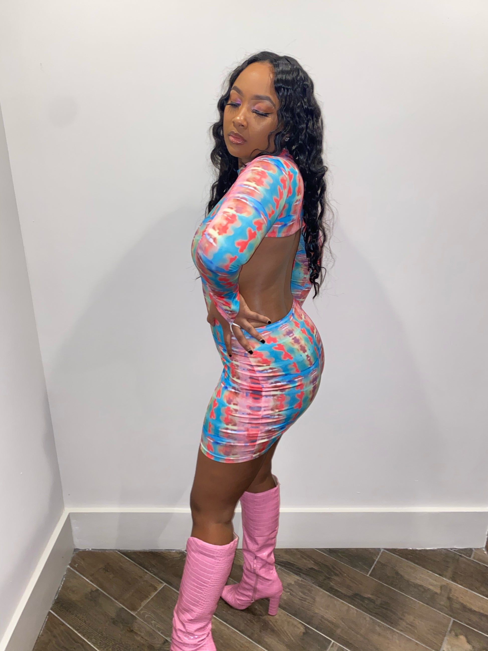 Mock turtle neck backless dress. Multicolored with optional finger band.