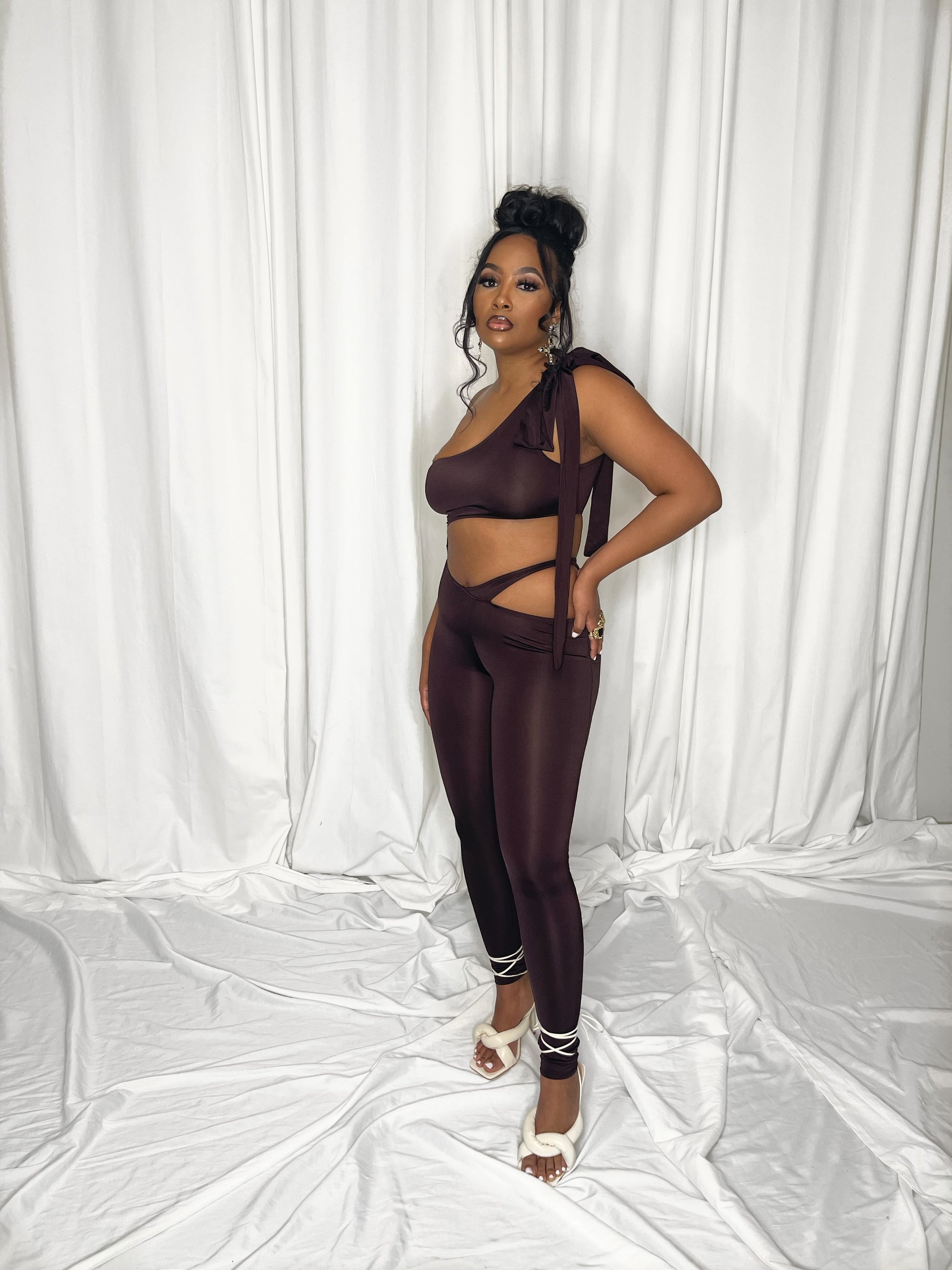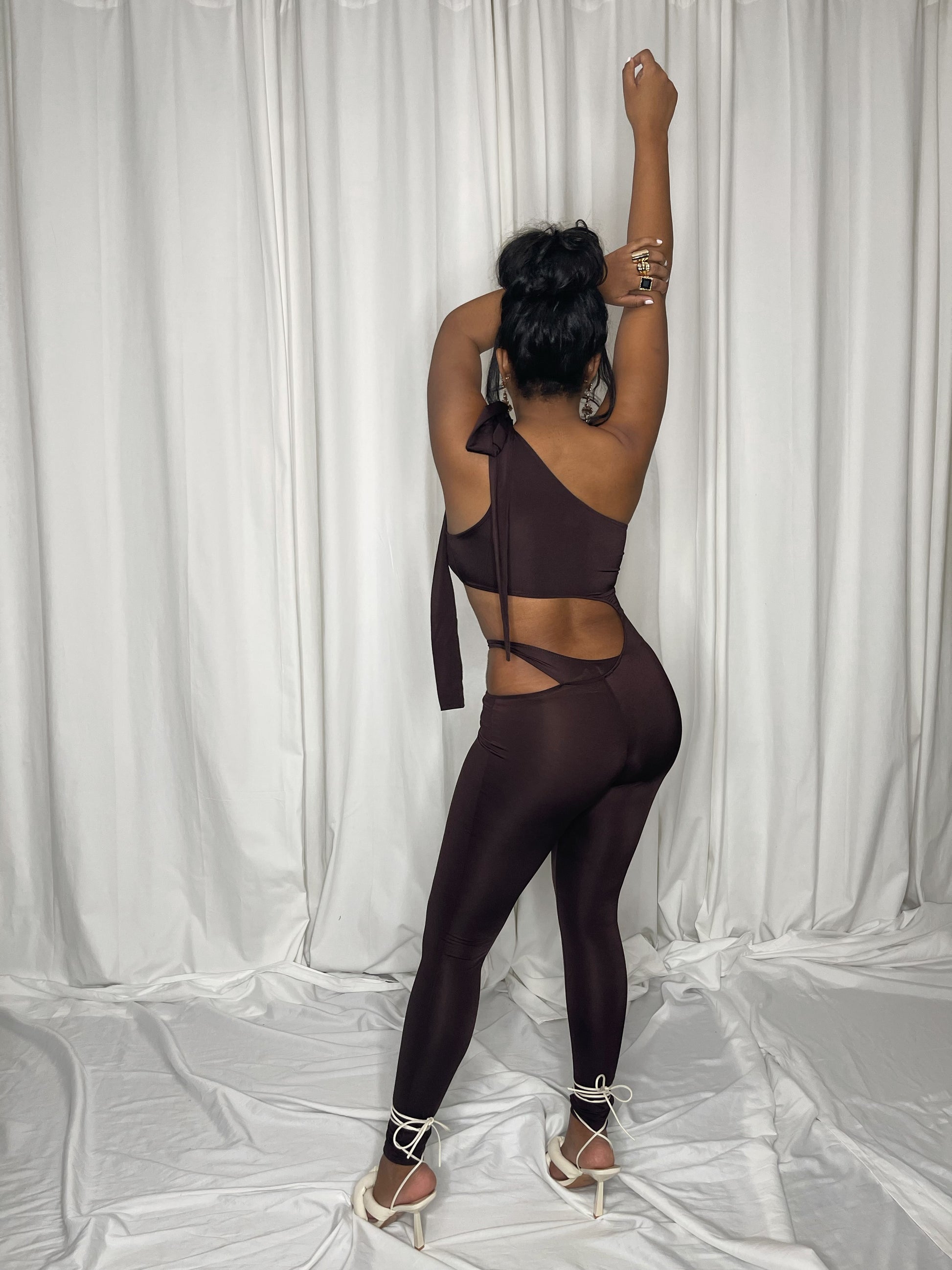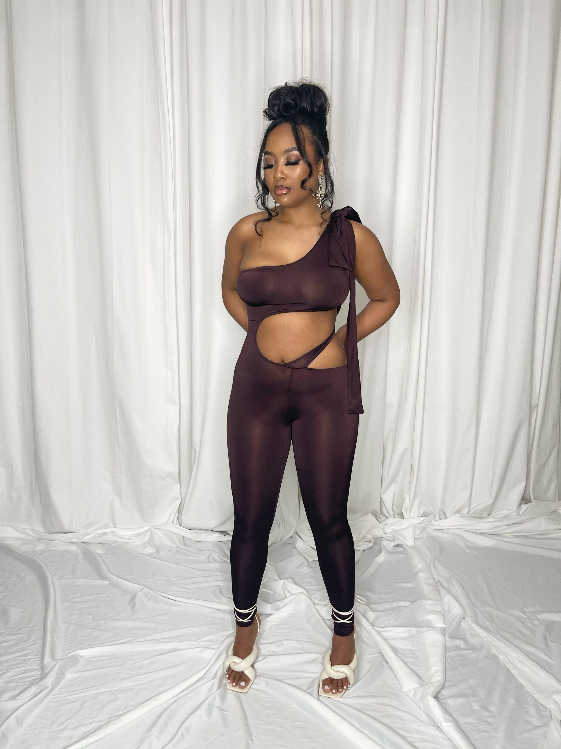 Cut out chocolate jumpsuit with strings attached. Strings can be tied in a bow or around the neck. Sexy look for a night out.