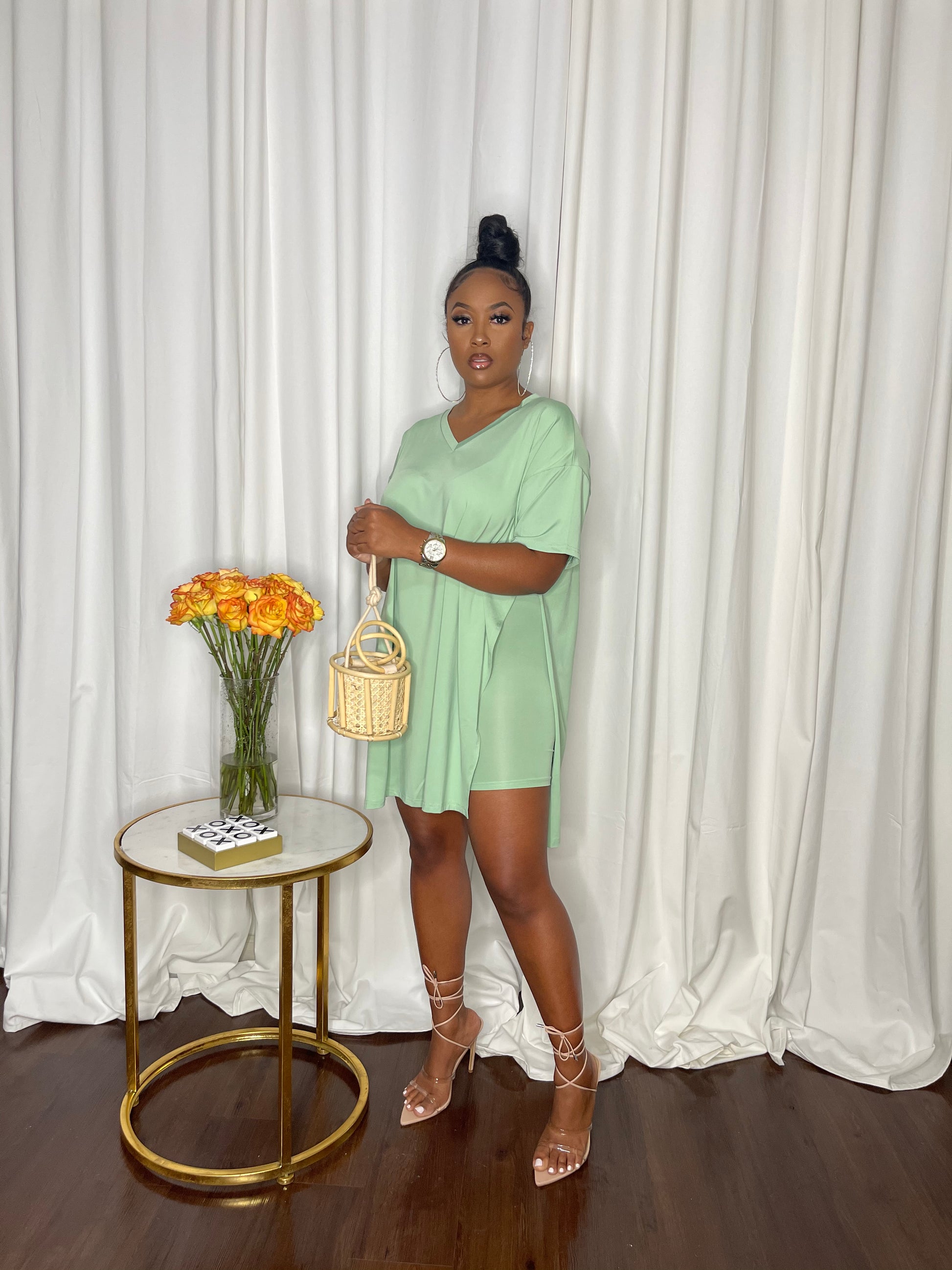 Two-piece set V neck line with short sleeves top & matching biker short. High slit on both sides of the shirt. This set can be tied in a knot in the front, back, and/or both.