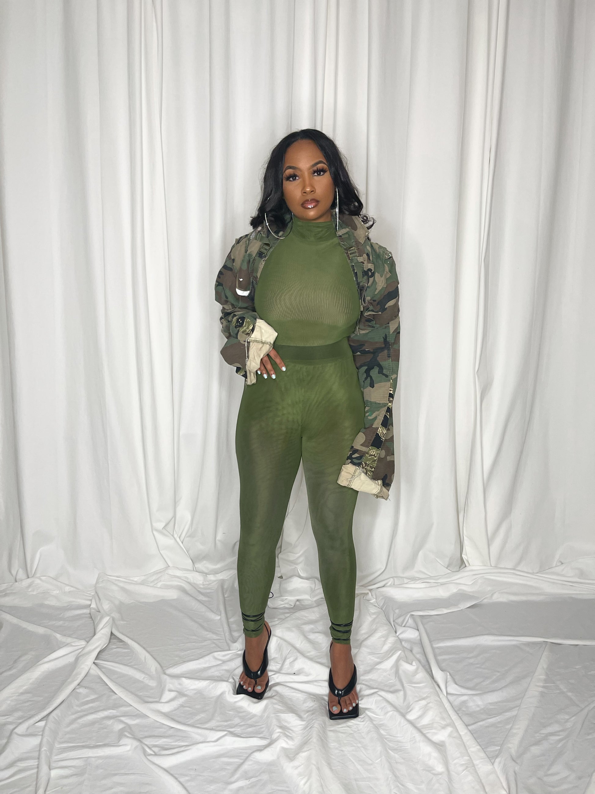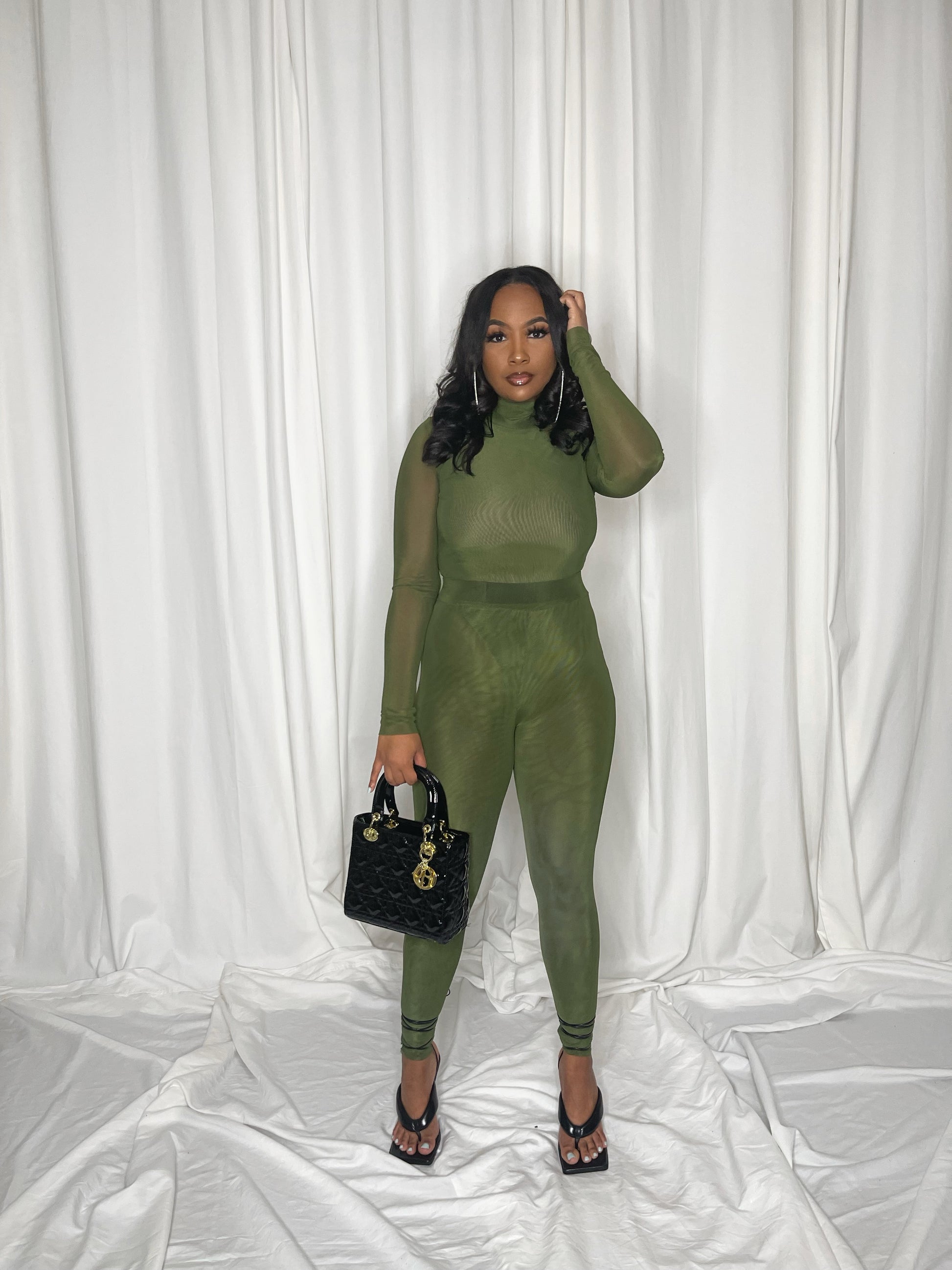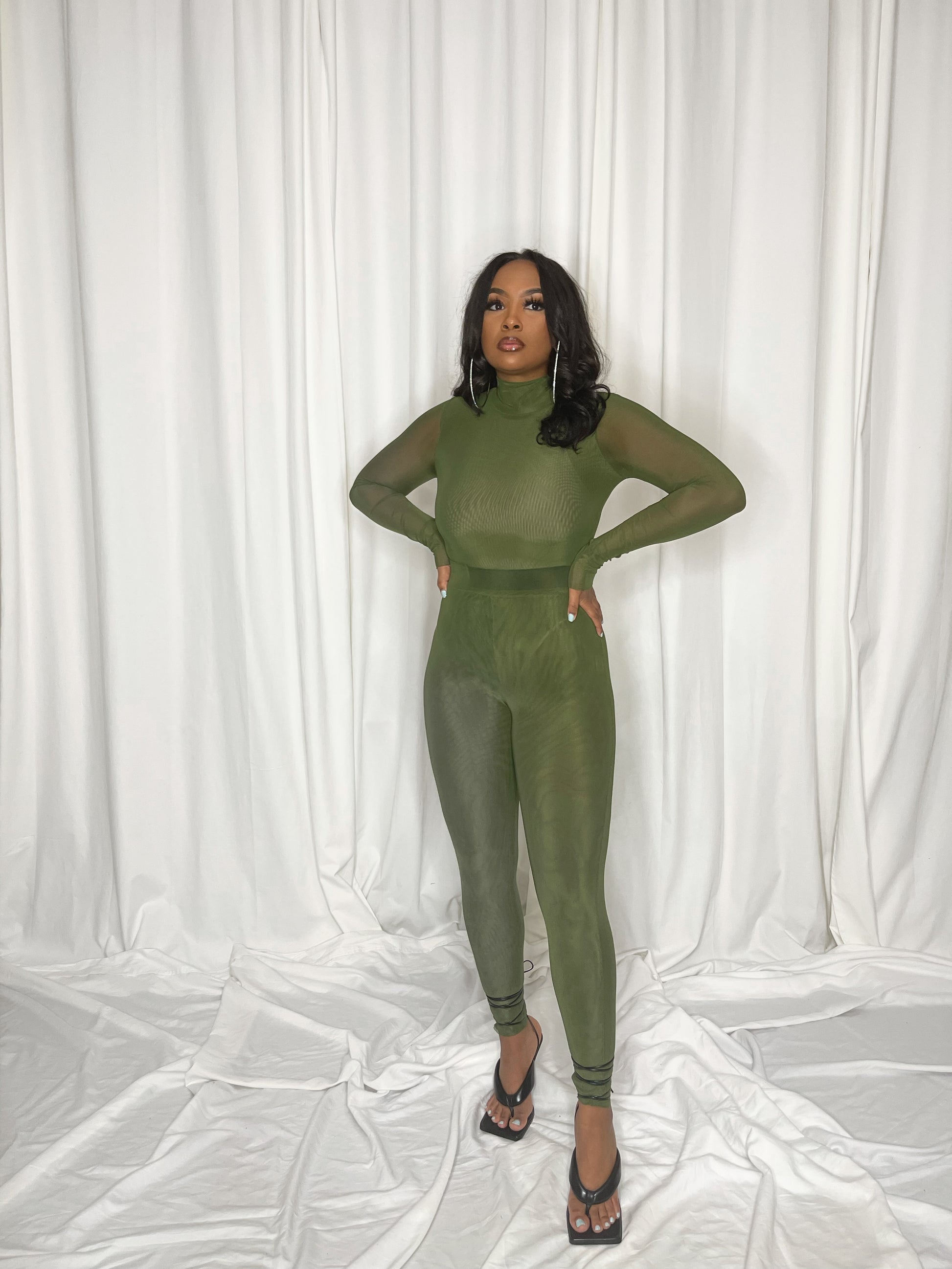 Olive green long sleeve, mock turtle neck, mesh two-piece set. Mesh is double lined pants and bodysuit.