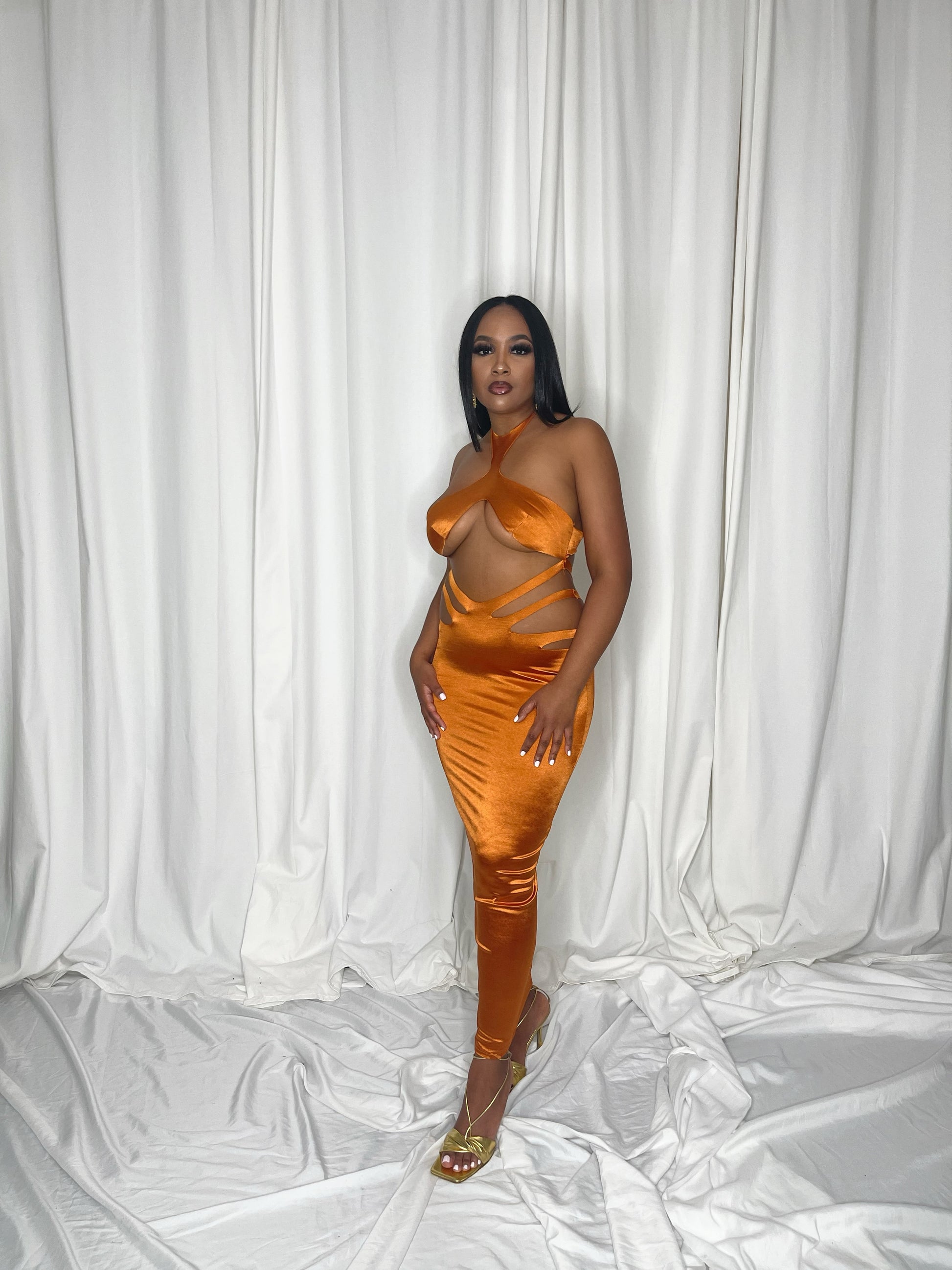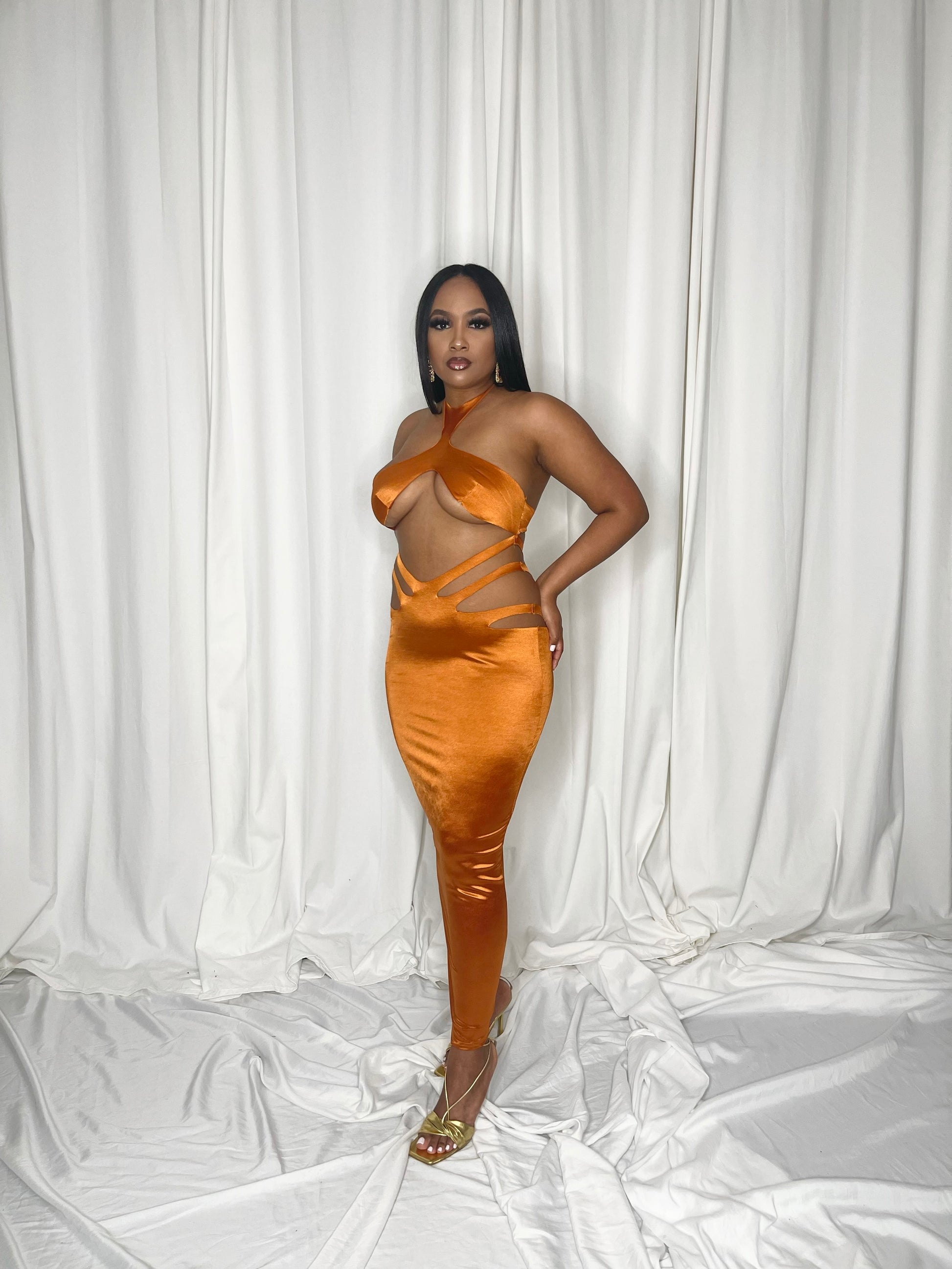 Copper cut out satin mid dress. Perfect dress of the hour the fit is amazing with soft silk like material. Dress has some stretch and top is halter style, can be tied to your liking.