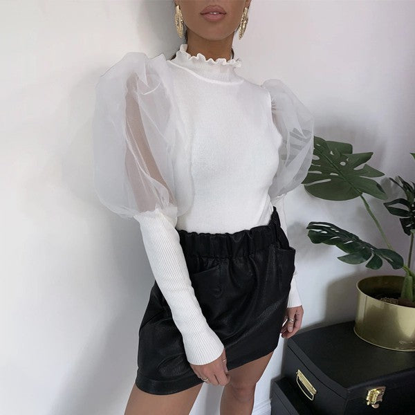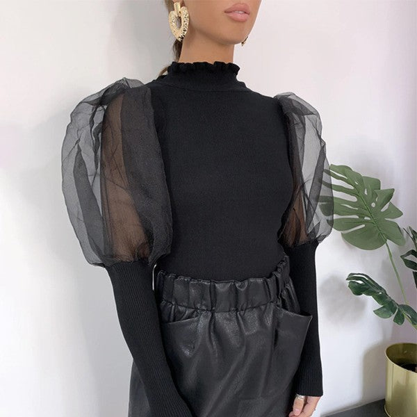 Tulle puffer sleeves mock turtleneck, fits true to size.